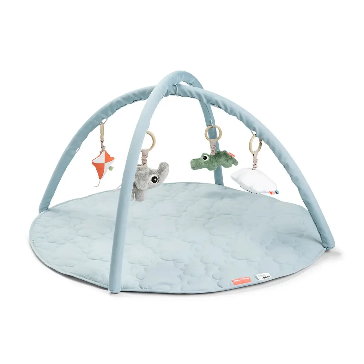The four hanging toys can be adjusted to match your baby’s developmental stage or detached for independent play, perfect for little fingers to discover. The soft quilted mat, adorned with a cute cloud pattern and thick wadding, ensures a cosy and comfortable space for playtime.