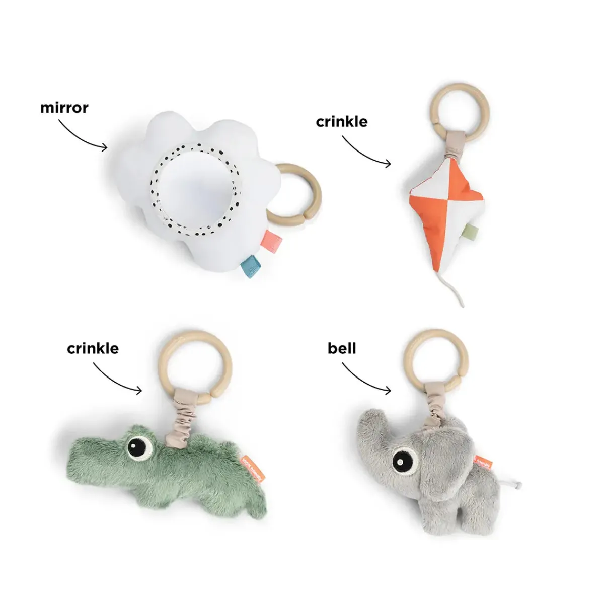 • Tilpas de fire hængende stykker legetøj til dit barns udviklingstrin