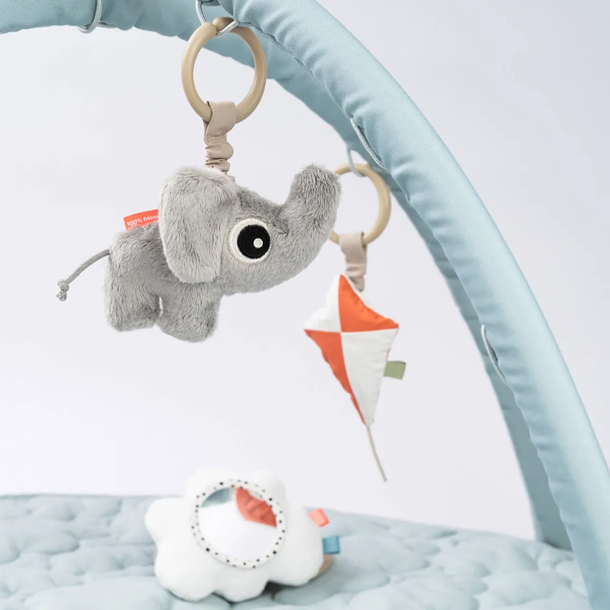 Legetæppe: 100% polyester. Legetøj: Stof: 80% bomuld 20% polyester. Fyld: 100 % polyesterfibre.