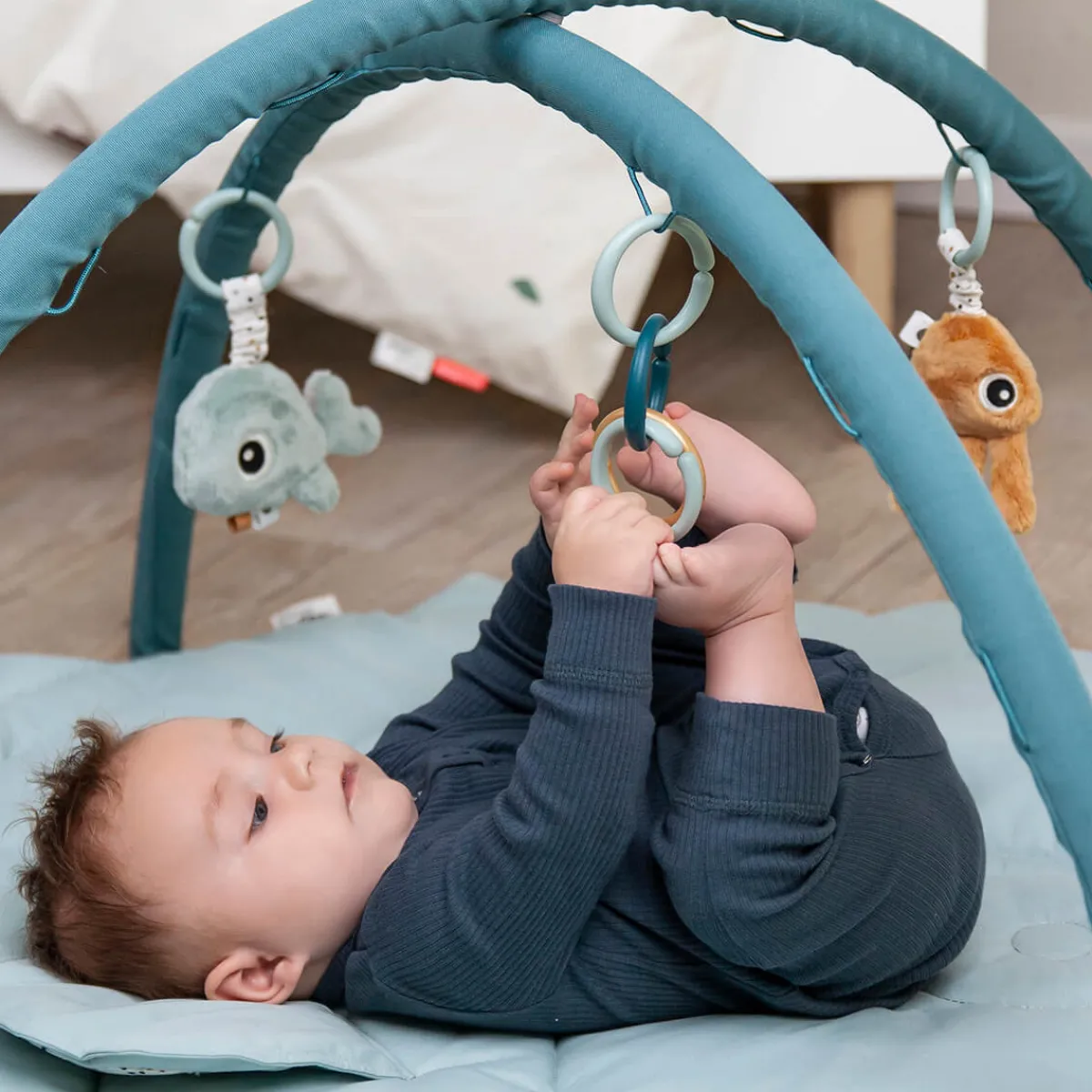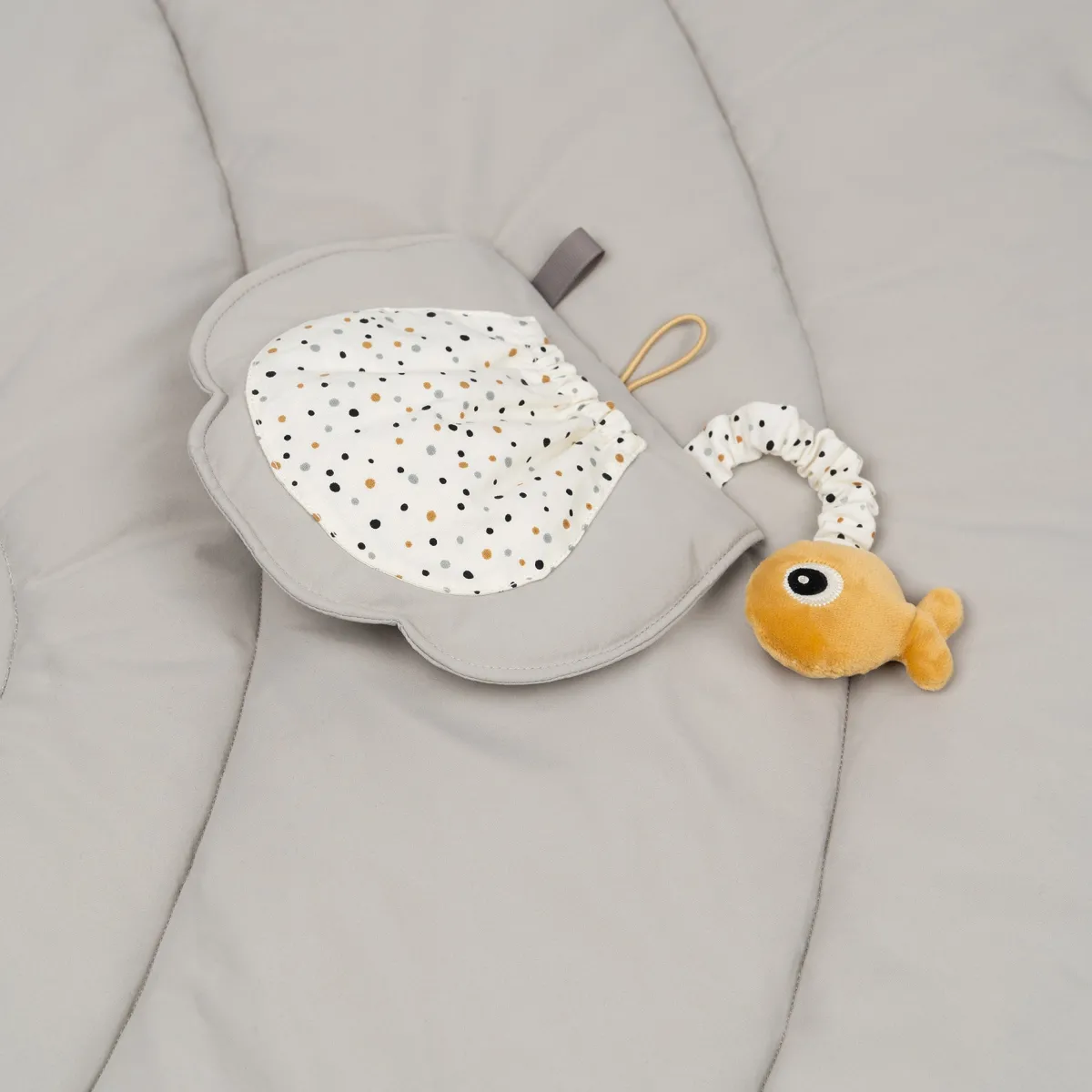 Et legetøj, der forbliver interessant, fra baby udforsker legetøjet ovenover, til at øve sig i mavetid og senere sætte sig op for at lege gemmeleg med den søde fisk. Det stilfulde og sjove babyaktivitetscenter er holdt i bløde toner af grå med kontrastfarver af sennep.