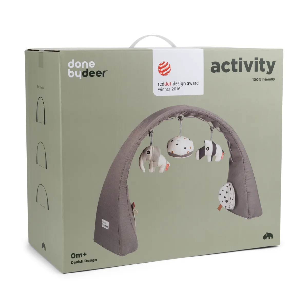Indeholder 5 aktiviteter: rangler, spejle, knitre-lyde, former og teksturer. De 3 stykker legetøj kan flyttes mellem 17 punkter på buen. Vinder af Red Dot Design Award 2016.