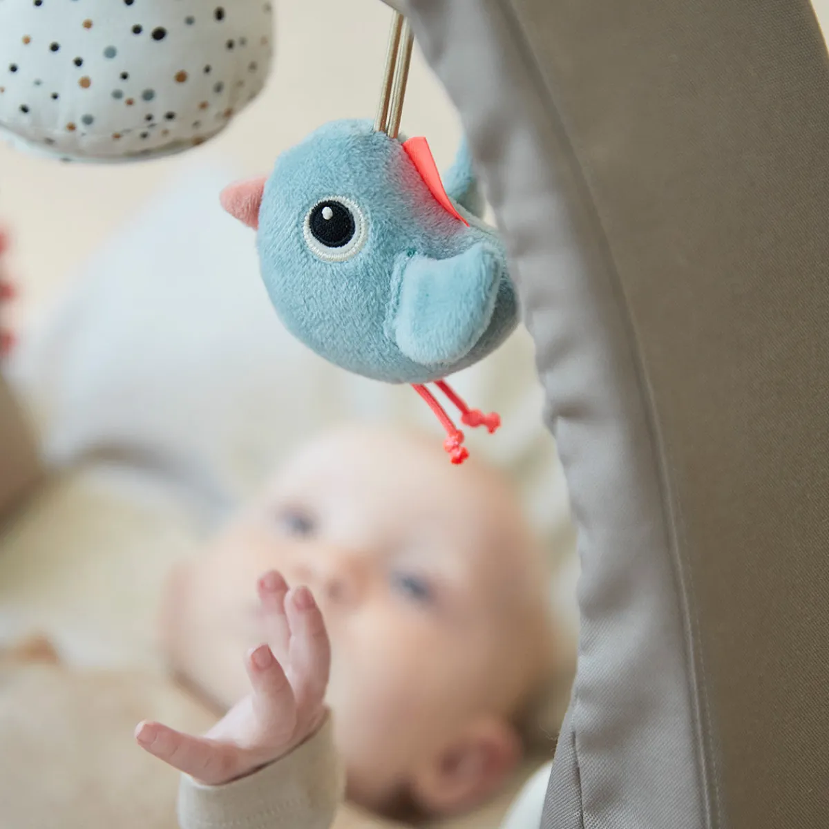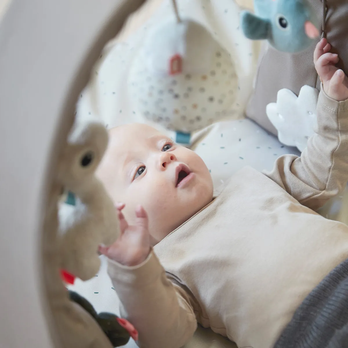 Lad din baby opdage sit søde ansigt i det lille bjergspejl, eller hav det sjovt med at prøve at gribe den superbløde og sanselige Lalee. Hør den søde klokke fra Birdees mave og knitre-lydene fra den bløde kaktus. Der er også et skjult spejl, der kan udforskes.