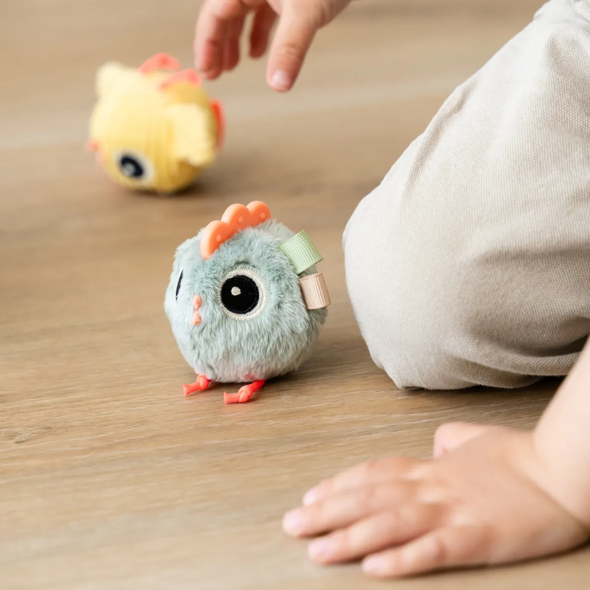 Når de små rækker hånden indeni, vil de opdage to små kyllinger med hver deres overraskelser. Den ene kylling har en bidekam og et klokkespil indeni, mens den anden gemmer på en klokke og krøllede vinger for ekstra, taktil sjov. Tag dem ud, sæt dem tilbage på plads, og gentag. Det er den perfekte måde at udforske objektpermanens og opbygge finmotorik på.