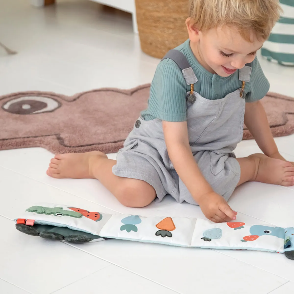 Det søde børnetæppe er formet som krokodillen Croco. Det har en blød og behagelig overflade, der er perfekt til sjove og legende stunder derhjemme. På bagsiden af tæppet har Croco praktiske skridsikre prikker.