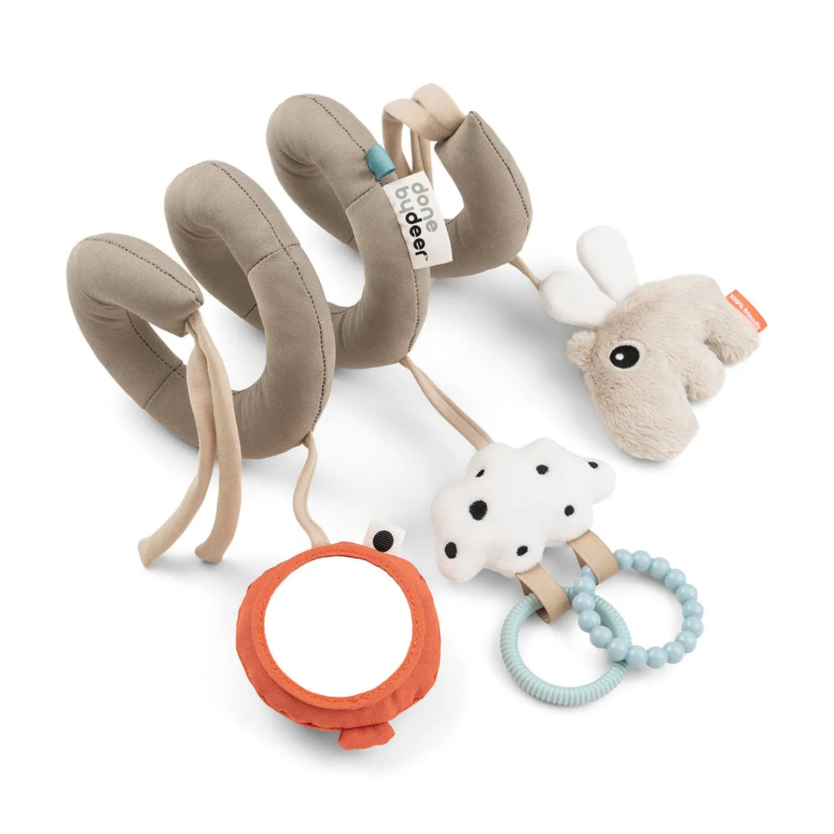 Aktivitetsspiralen Happy Clouds er den perfekte underholder, når du er på farten, og den er fuld af sanseindtryk, som dit barn kan udforske. Babylegetøjet kan fastgøres til tremmesengen, autostolen, klapvognen eller barnevognen ved hjælp af de bløde snore.