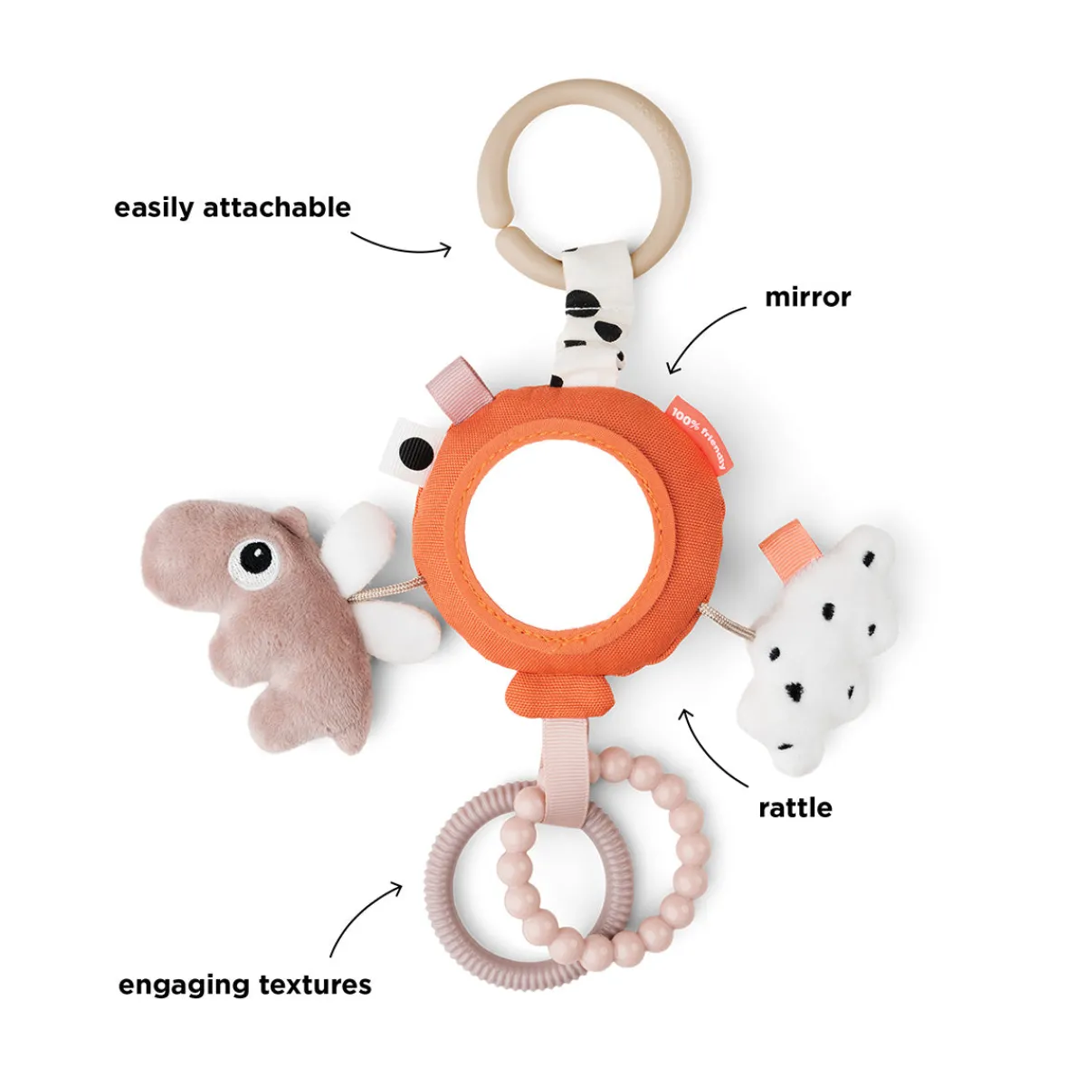 Aktivitetsspejlet har en ballonrangle, en blød tekstureret Ozzo og sky, to teksturerede ringe og sjove tags. Barnet kan nemt gribe fat i ringene og holde aktivitetsspejlet. Brug Ophængsringen til at fastgøre det til barnevognen, autostolen eller mavepuden.