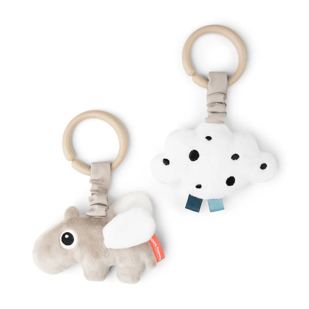Det søde Aktivitetsophæng består af en sandfarvet Ozzo og en hvid sky med sorte prikker, begge med et elastikbånd i sand.