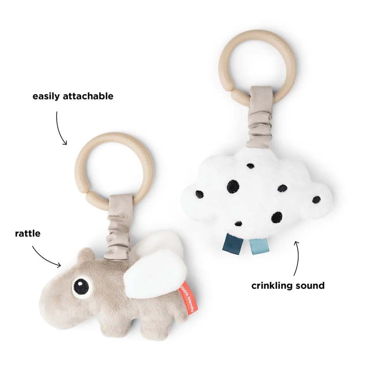 Den nuttede Ozzo har en sjov rangle indeni, og den søde sky har en sensorisk knitrelyd. Begge stykker legetøj er udstyret med sensoriske mærker, der kan udforskes, og er nemme at hænge op med det praktiske legetøjslink.
