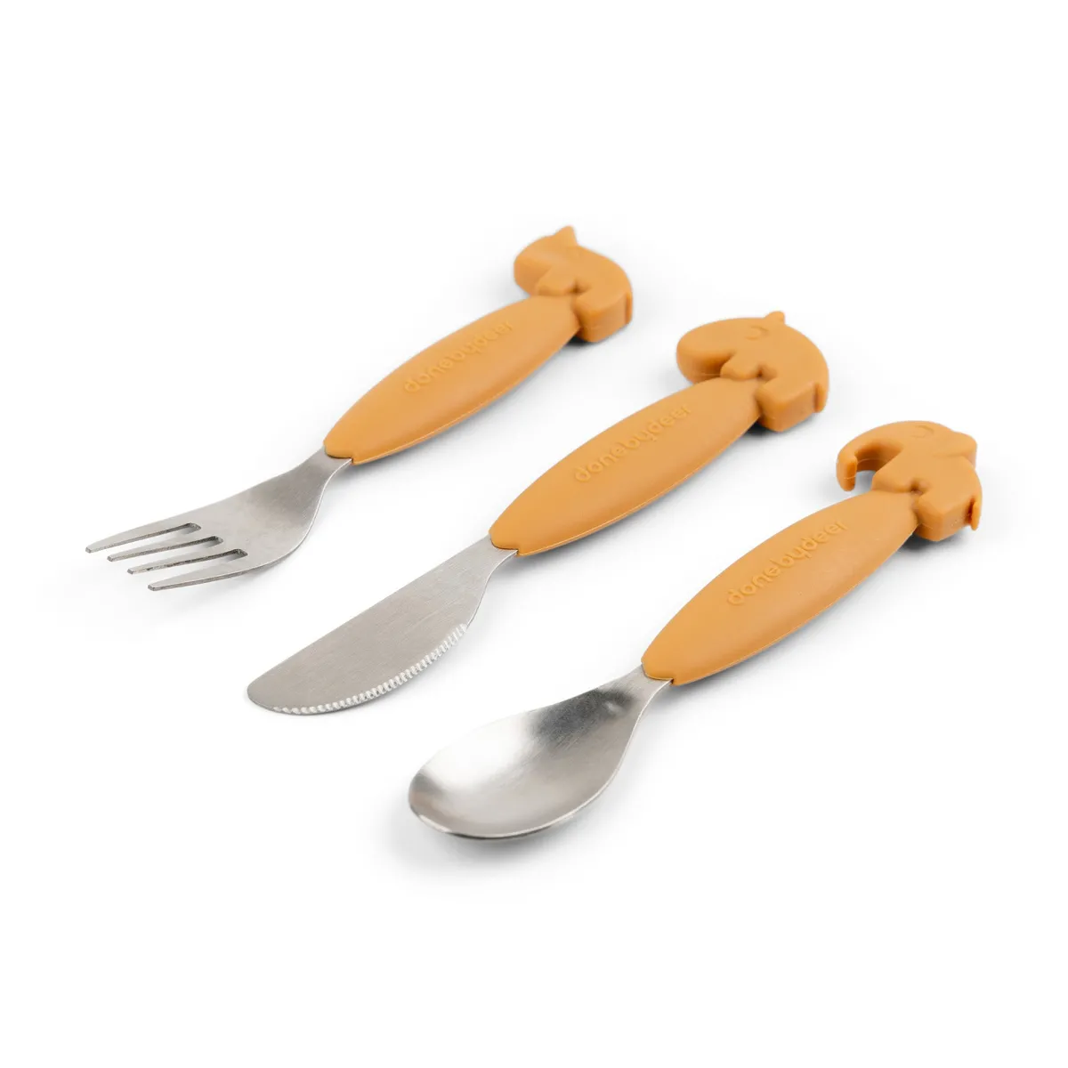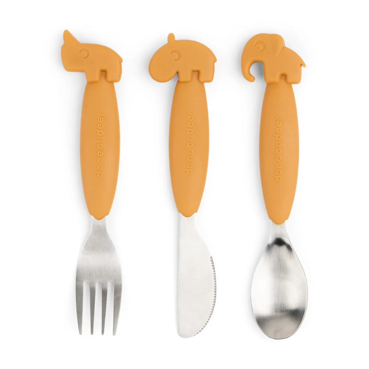 Mustard Ozzo-kniven, Nozo-gaffelen og Elphee-skeen matcher hele Done by Deer-serviset.