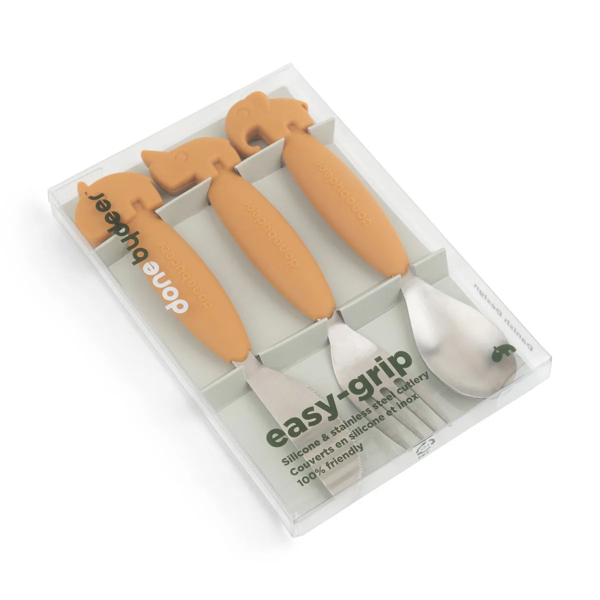 Det søde bestik har bløde, skridsikre silikonehåndtag og vil hurtigt blive et yndlingssæt. Størrelsen på bestik til børn er perfekt til et selvstændigt lille barn, der skal lære at spise selv.