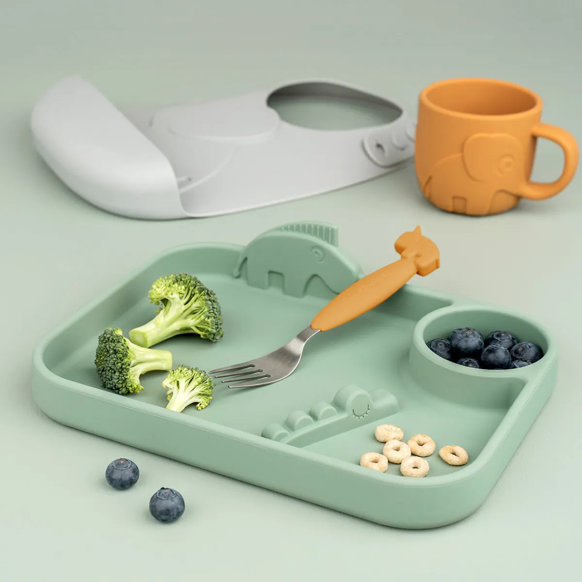 Dette produkt er testet og overholder den europæiske standard for børnebestik EN 14372 og EU-forordningerne om fødevarekontakt 1935/2004 og den tyske LFGB §30 og 31 for silikone.