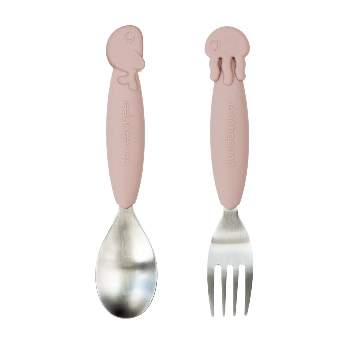 Sea Friends-bestikket har en blød pastelfarve, der passer godt til Done by Deer-børneservicen.