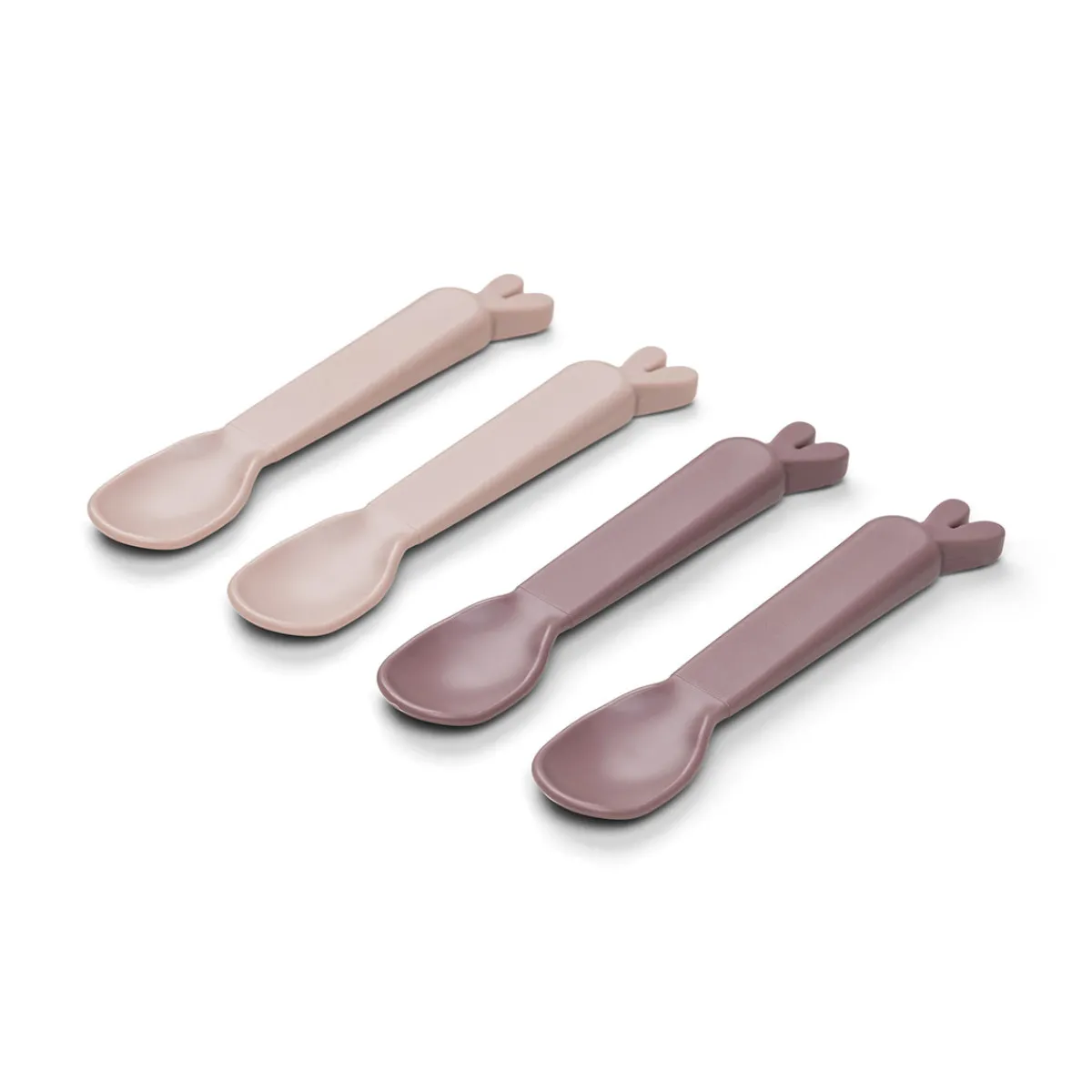 En praktisk 4 stk Kiddish skeer i to nuancer af pudder. Skeerne har en eksklusiv, mat og silkeagtig overflade, som føles rar for barnet.