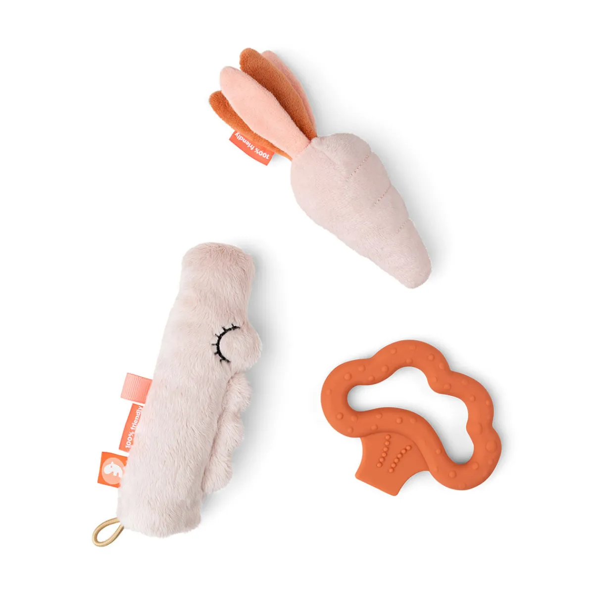 Det lille Tiny Toys gavesæt i en fin nuance af pudder og et stænk af papayafarve er den perfekte gave til en baby.