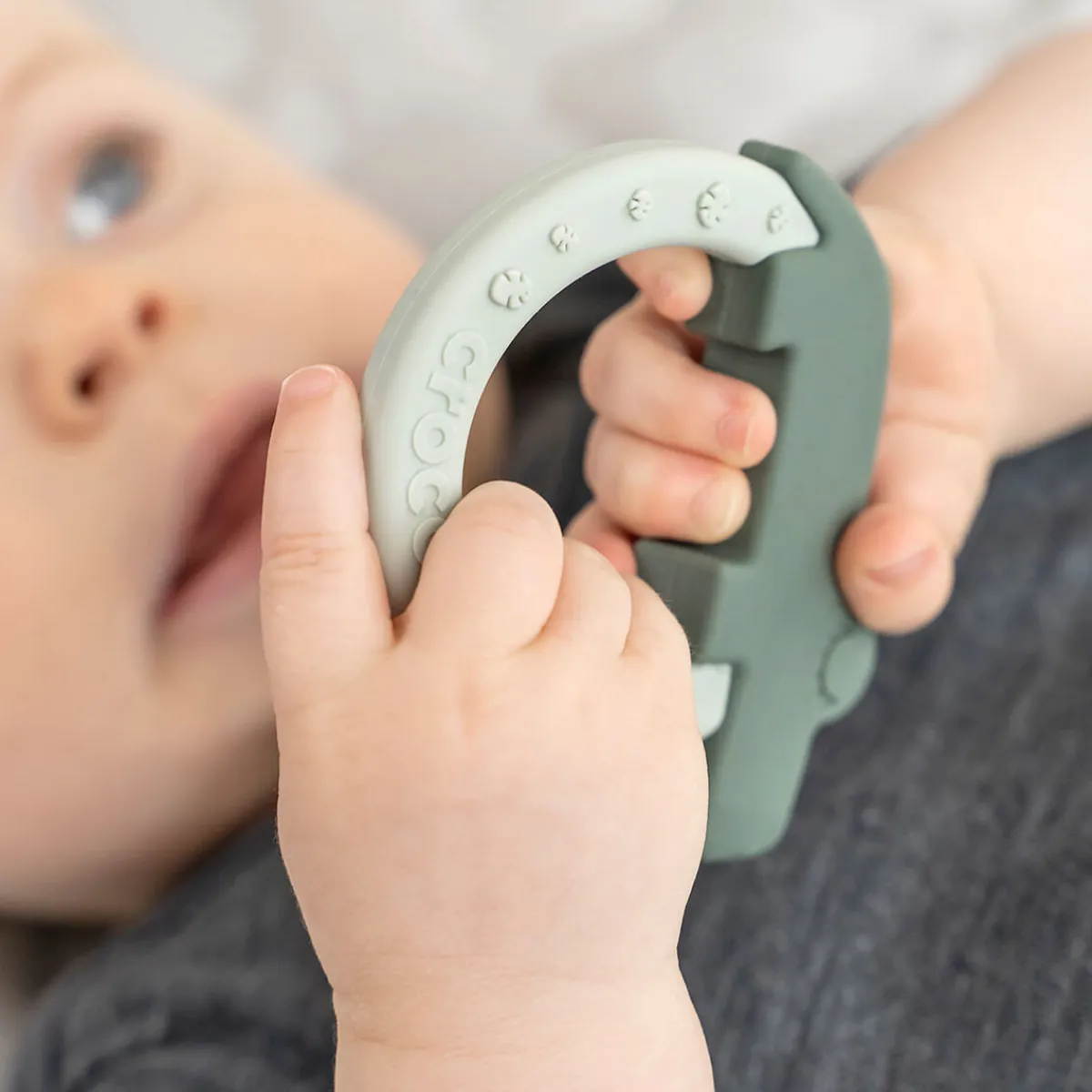 Bideringssættet er designet til at passe til selv den mindste hånd og stimulerer både barnets visuelle, orale og taktile sanser. Nuancer af blød blå og grøn, sjove teksturer og den søde elefant og sjove krokodille gør dette sæt til det perfekte første stykke legetøj.