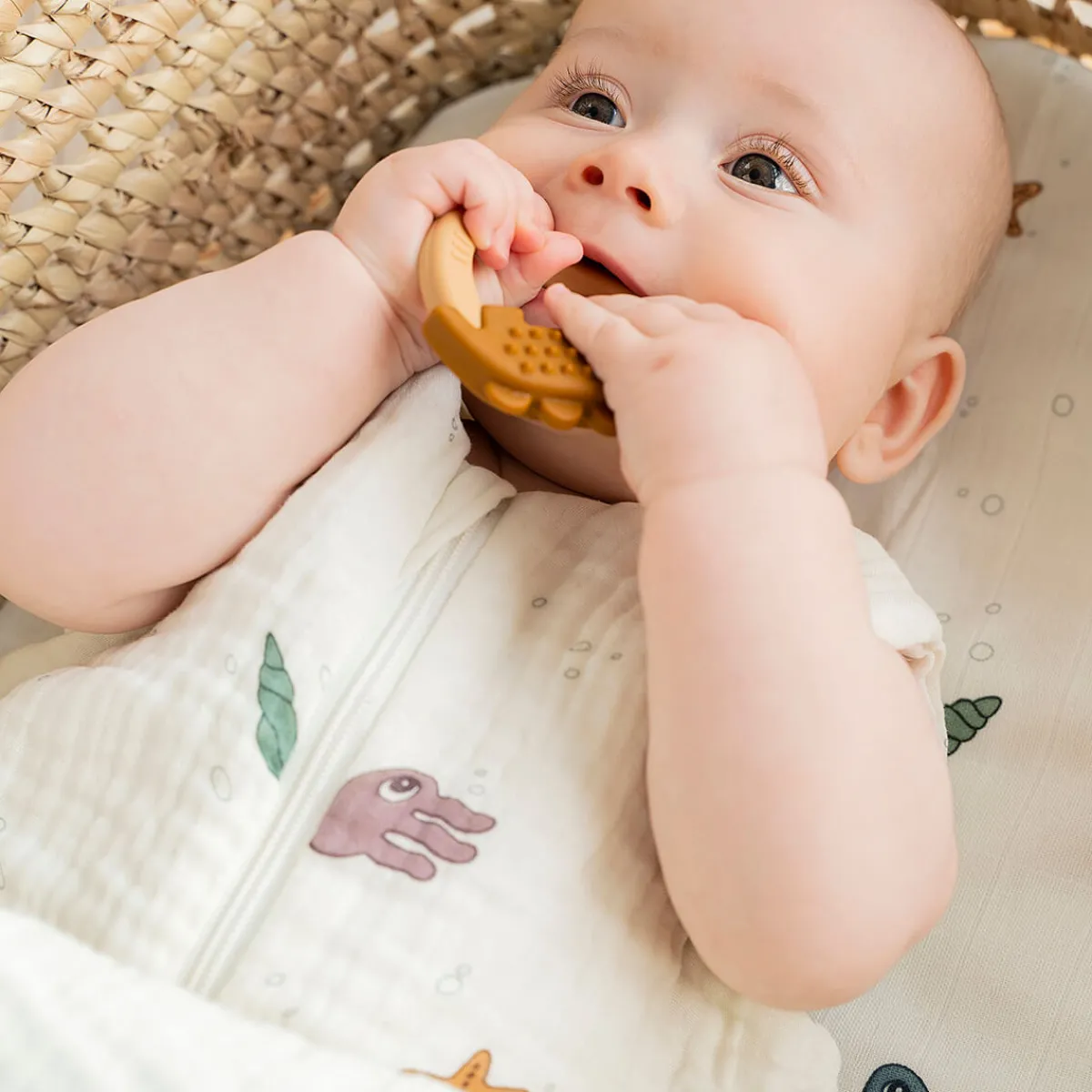 Bideringssættet er designet til at passe til selv den mindste hånd og stimulerer både barnets visuelle, orale og taktile sanser. Nuancer af blød pudder og sennep, sjove teksturer og den søde elefant og sjove krokodille gør dette sæt til det perfekte første legetøj.
