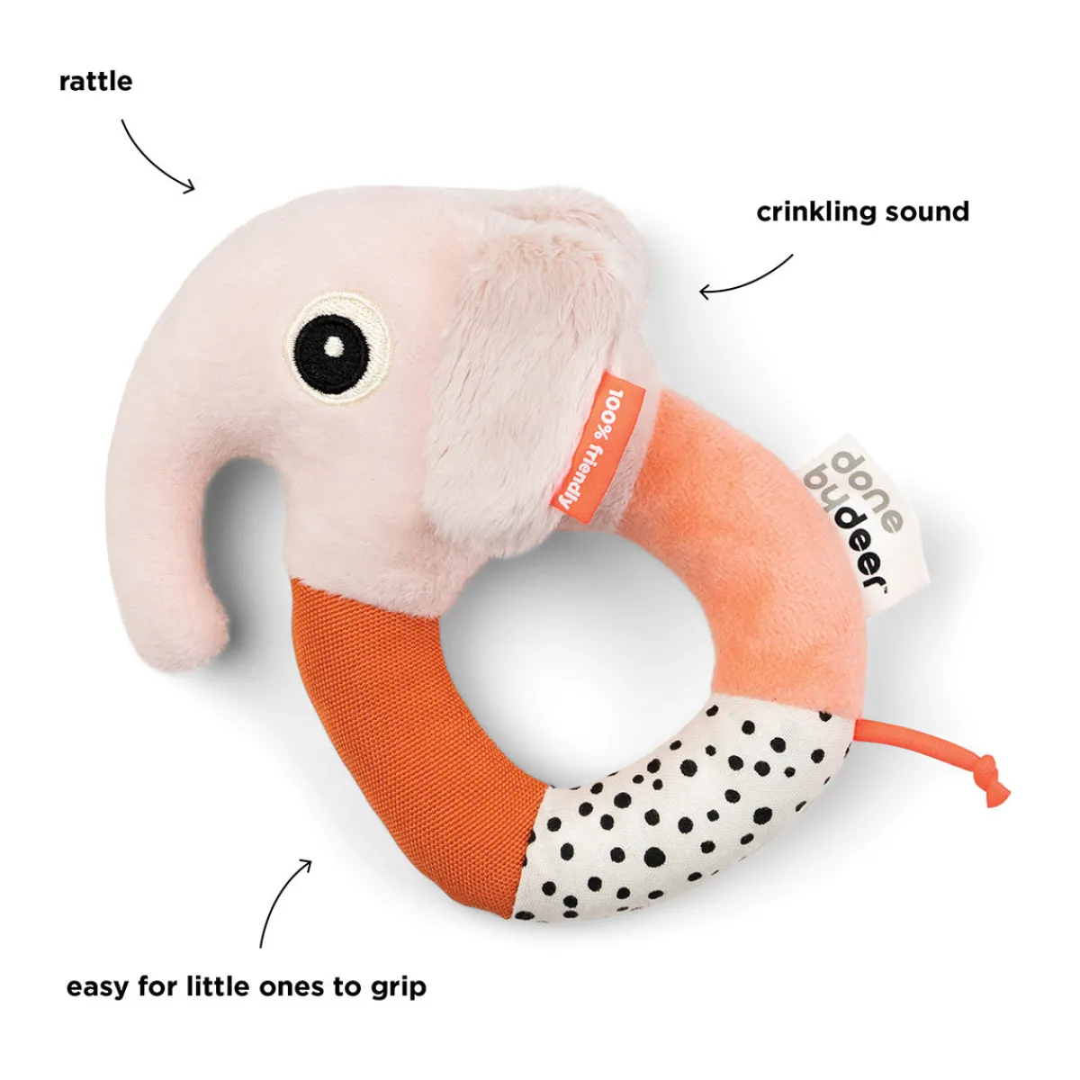 Den bløde Rund rangle har flere elementer, der stimulerer din baby. De mange farver og teksturer gør den sjov at se på og røre ved. Elphee laver en sød ranglelyd, når den bliver rystet, og ørerne har en sjov knitre-lyd.