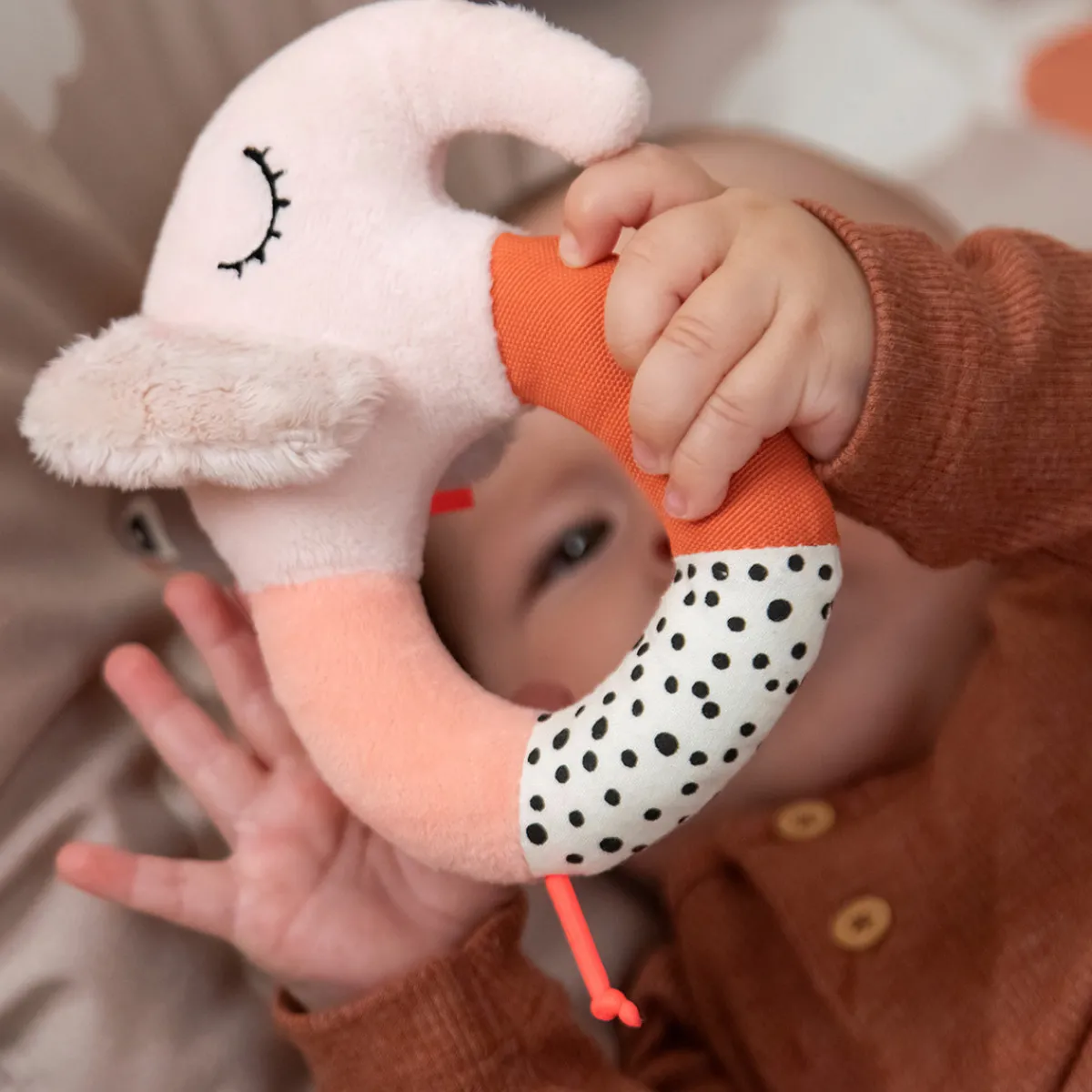 Denne Rund sanserangle med Elphee er god underholdning for din baby. Ringen gør det nemt for små hænder at holde på ranglen, og de sjove lyde vil holde din baby underholdt.