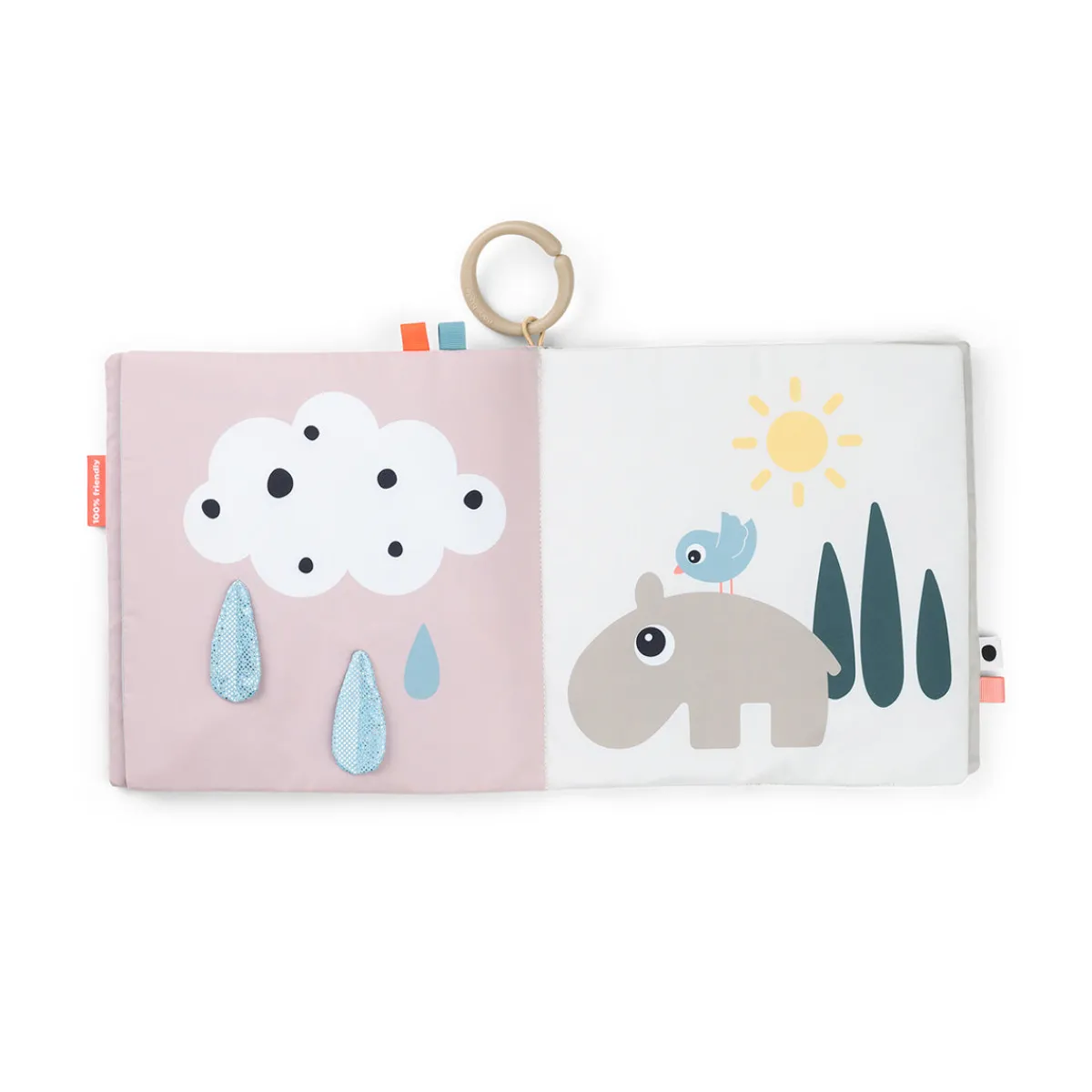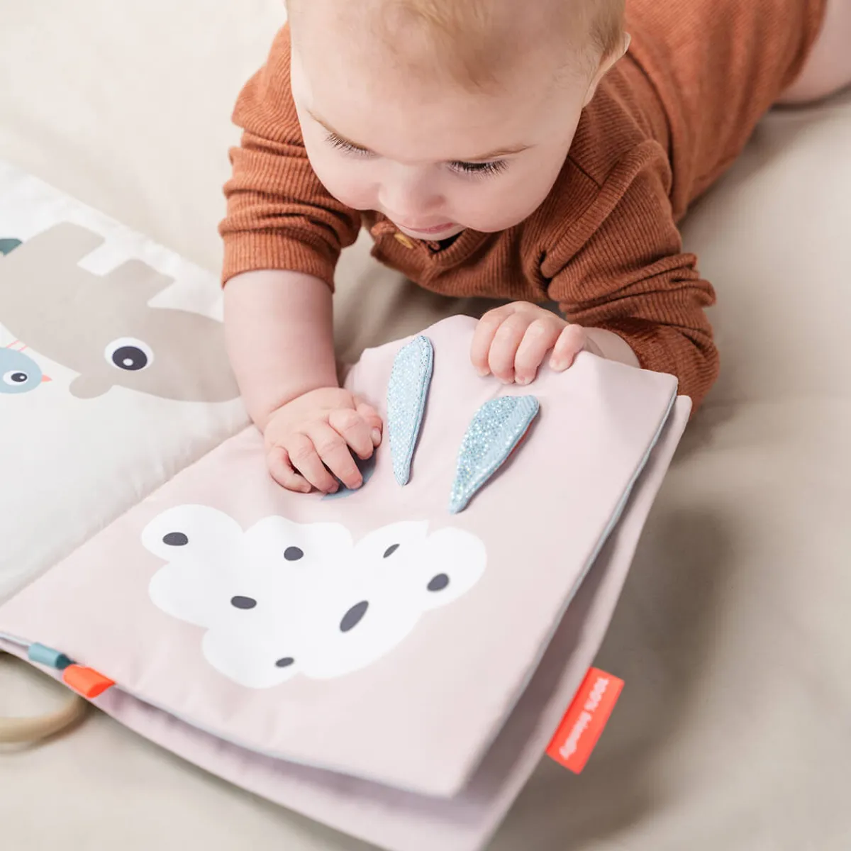 En elastisk løkke gør det nemt at sætte den fast på barnevognen, når man er på farten. Plej den tidlige udvikling, og gør læring til en fornøjelse med denne sanserige, interaktive Tummy time stofbog, der er designet til både sjov og kognitiv vækst i din babys første måneder.