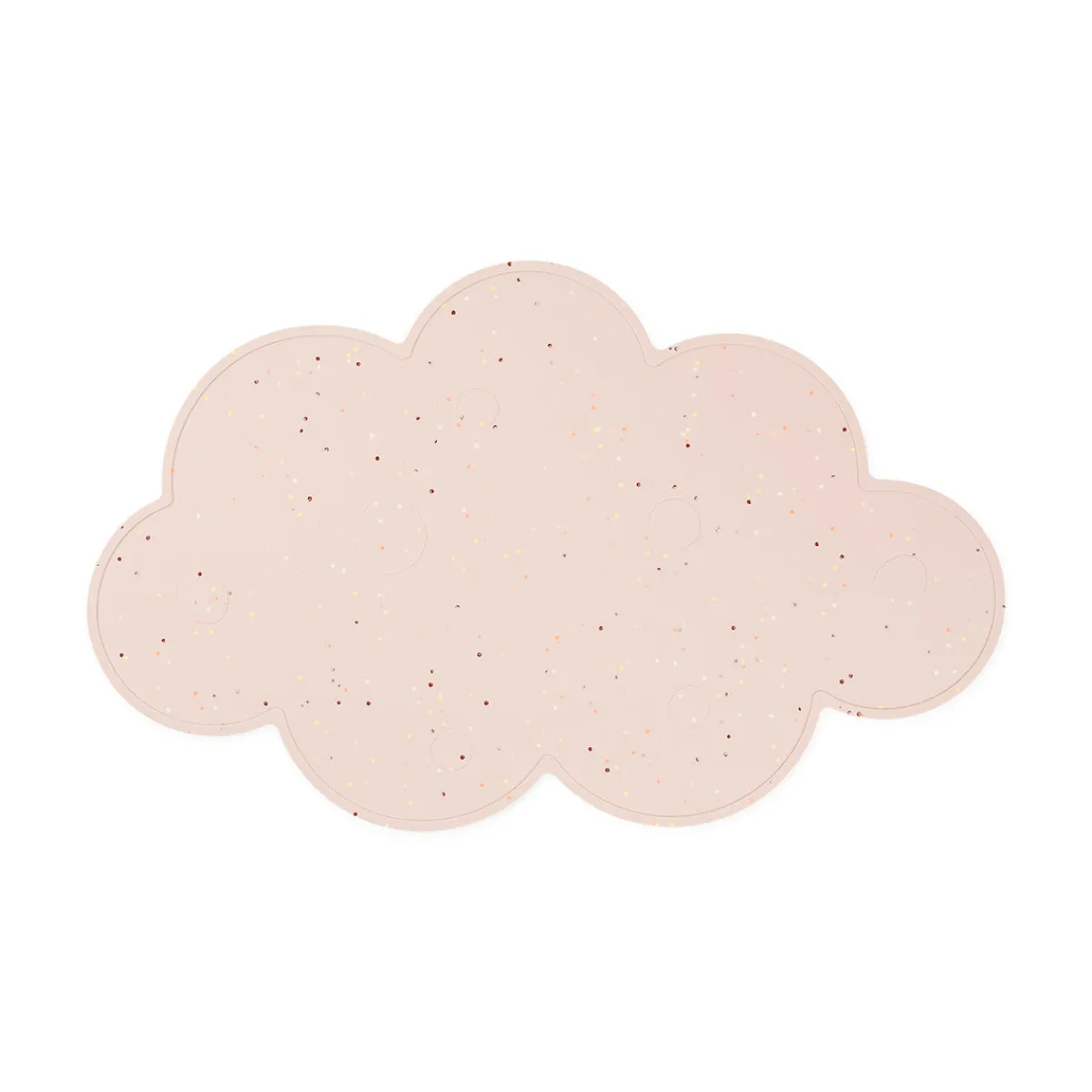 Praktisk skyformet dækkeserviet i en sød pudderfarve, drysset med sjov confetti. Dækkeservietten er fremstillet af 100 % fødevaregodkendt, BPA-fri silikone og giver børnene en sikker oplevelse. Den lille forhøjede kant stopper effektivt spildt væske, mens silikonens skridsikre egenskaber holder dækkeservietten sikkert på plads under barnets måltid.