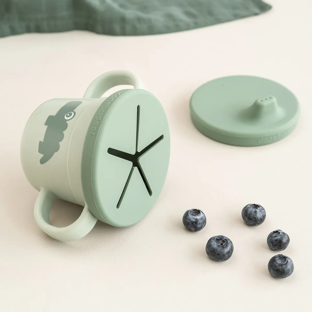 Den seje grønne tud- og snackkop er trykt med den hjertevarme krokodille, Croco, på den ene side og skyer på den anden. Tudelågets mørkere grønne farve giver en fin tofarvet detalje.