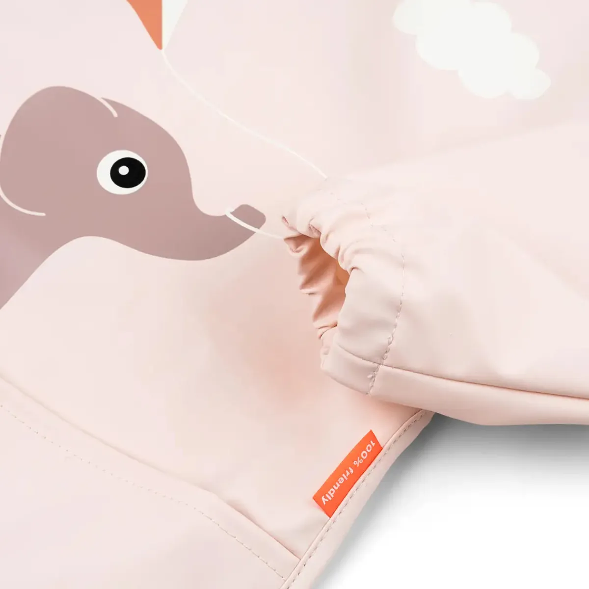 Denne søde, pudderfarvede hagesmæk har et sødt motiv af Elphee, der flyver med en drage. Hagesmækken sikrer renlighed med sin vandtætte overflade, der beskytter tøjet mod spild og snavs. Tilføjelsen af beskyttende ærmer giver ekstra dækning og holder dit barns tøj sikkert.