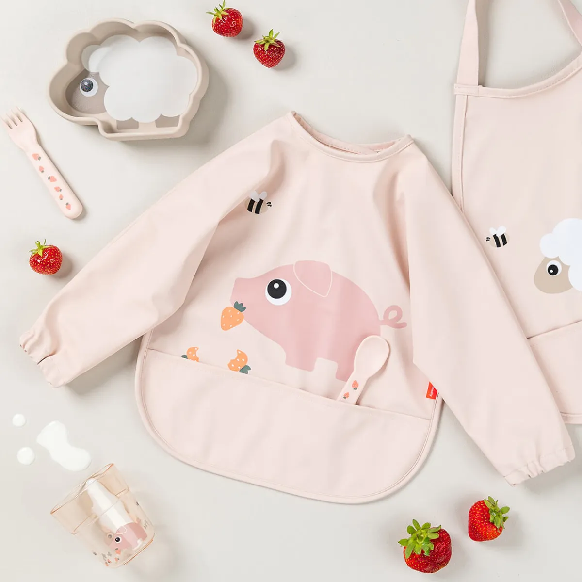 The water-repellent surface and sleeves ensure clothes stay dry and clean, while also making it super easy to wipe down. The adjustable double closure provides a comfy, secure fit, and the cute powder colour with a playful Pigee motif adds a fun touch to mealtime.