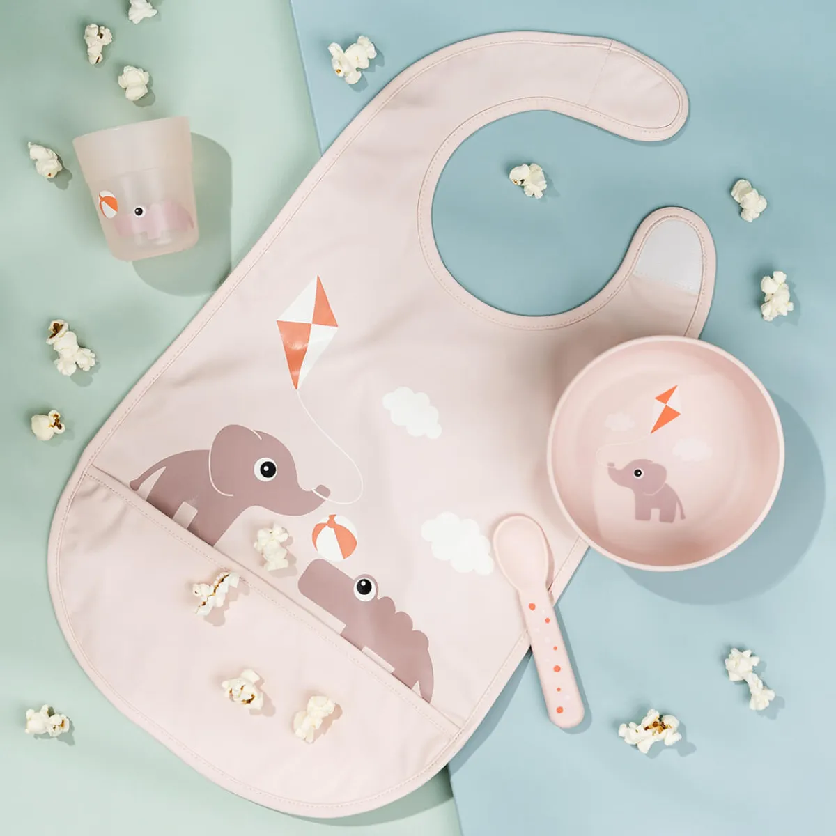 Denne praktiske hagesmæk med velcro i en sød pudderfarve er designet til at gøre måltiderne sjove for dig og dit barn. Med et legende motiv af Elphee og Croco, der nyder Playground, tilføjer hagesmækken et strejf af legesyge til hvert måltid.