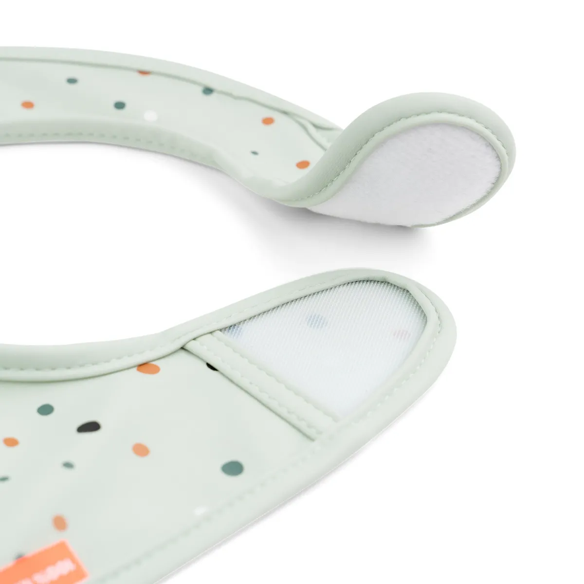 Det søde sæt hagesmække er i en blød grøn nuance. Den ene er dekoreret med Croco og ildfluer, og den anden er dækket af Happy dots i bløde farver.