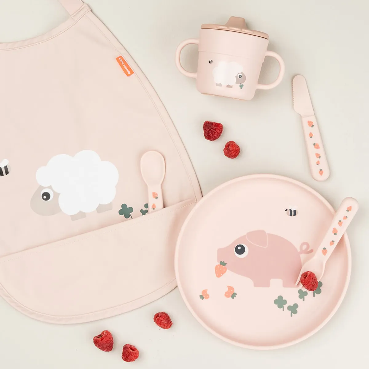 The elastic strap ensures easy dressing, while the pocket at the bottom catches any dropped food, keeping your little one clean and comfy. With a lovely powder colour and an engaging Sheepy motif, this bib brings a touch of fun to every meal.