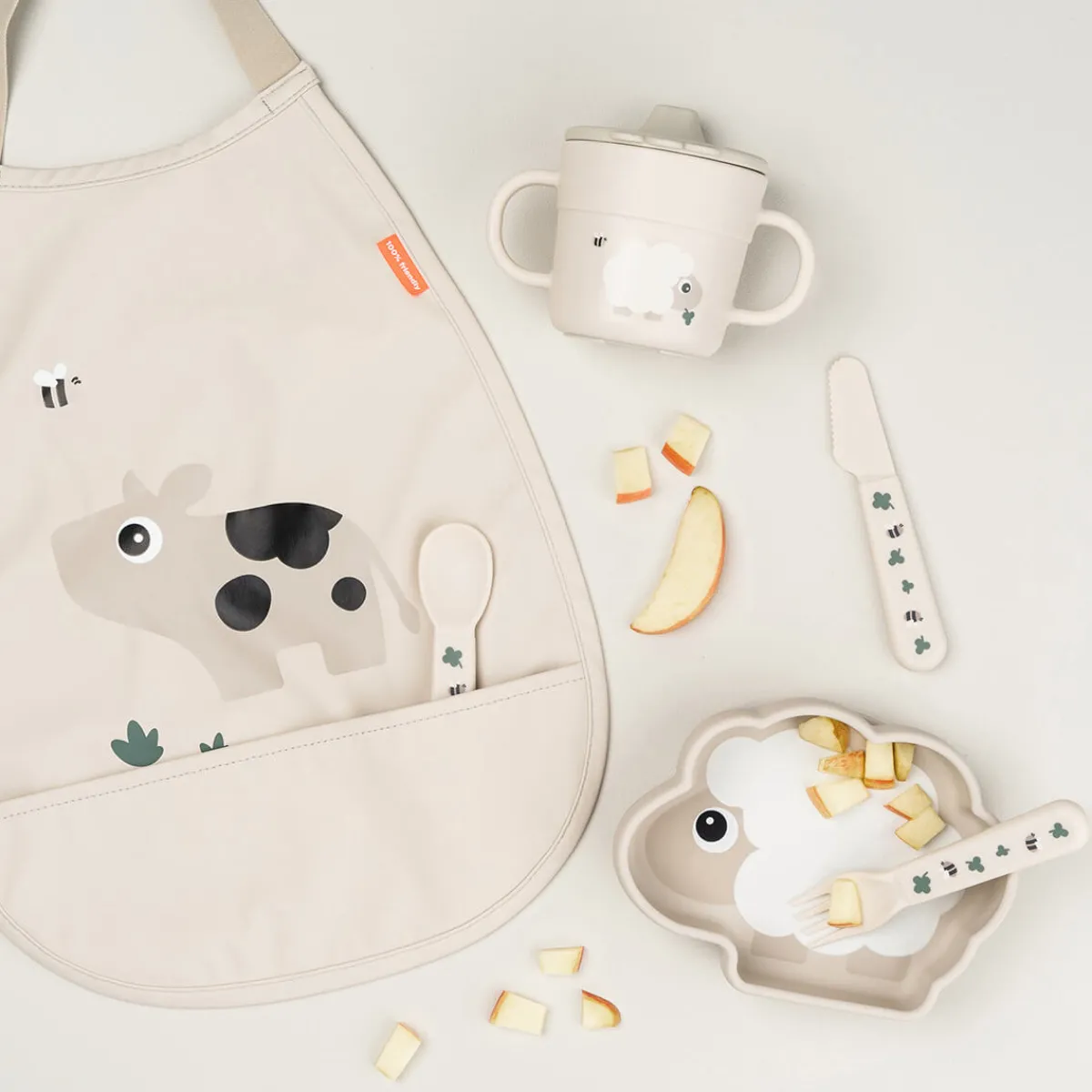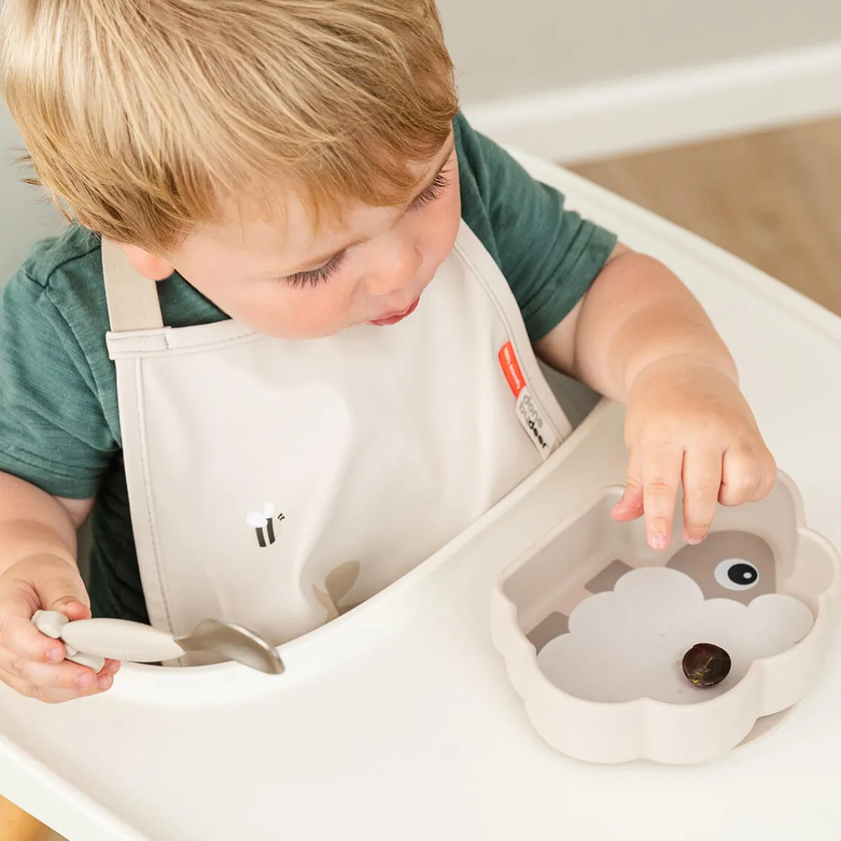 The elastic strap allows for quick dressing, while the handy pocket catches dropped food, reducing mess. In a soft sand colour with a charming Dotti motif, this bib adds a playful touch to every meal.