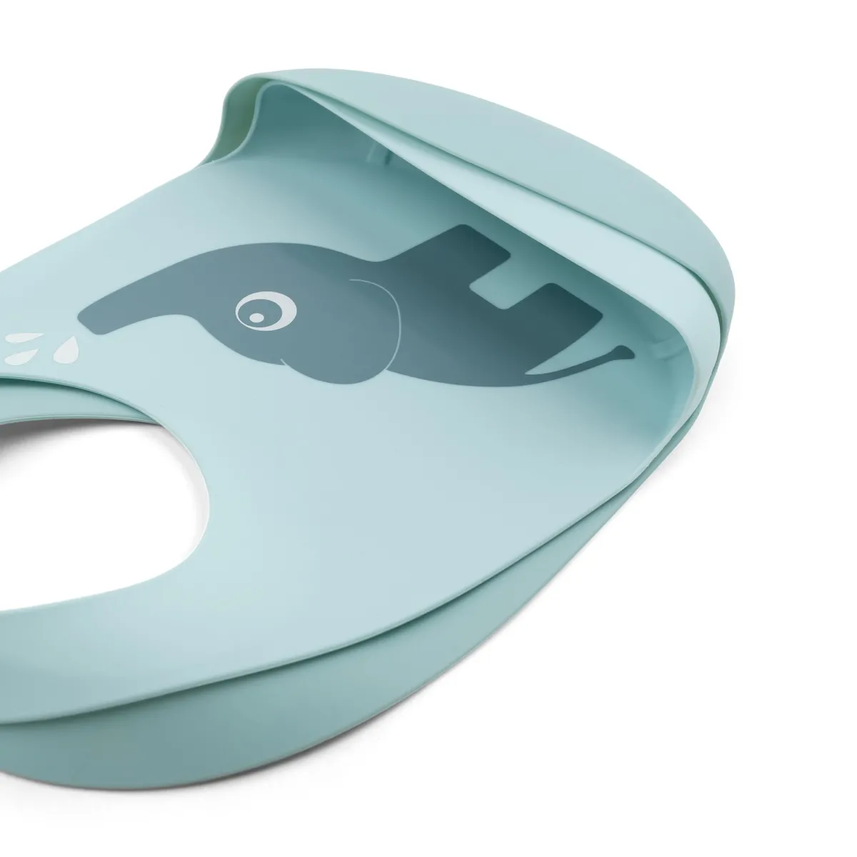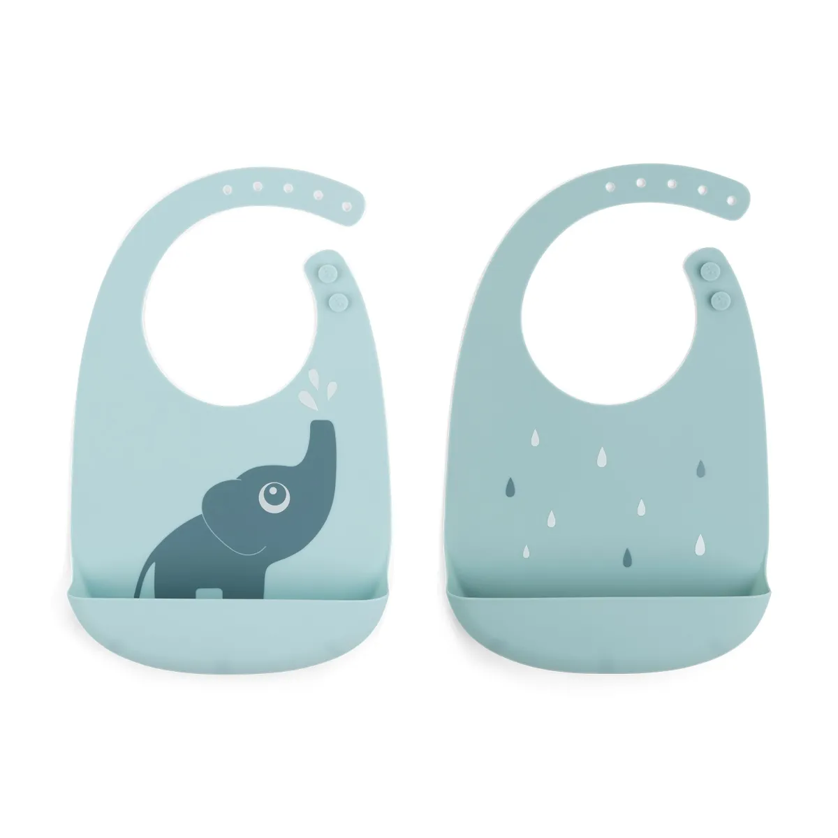 De søde blå hagesmække er dekoreret med Deer friend Elphee og legesyge vanddråber. Silikone elefanthagesmækken er nem at tørre af eller vaske i opvaskemaskinen.