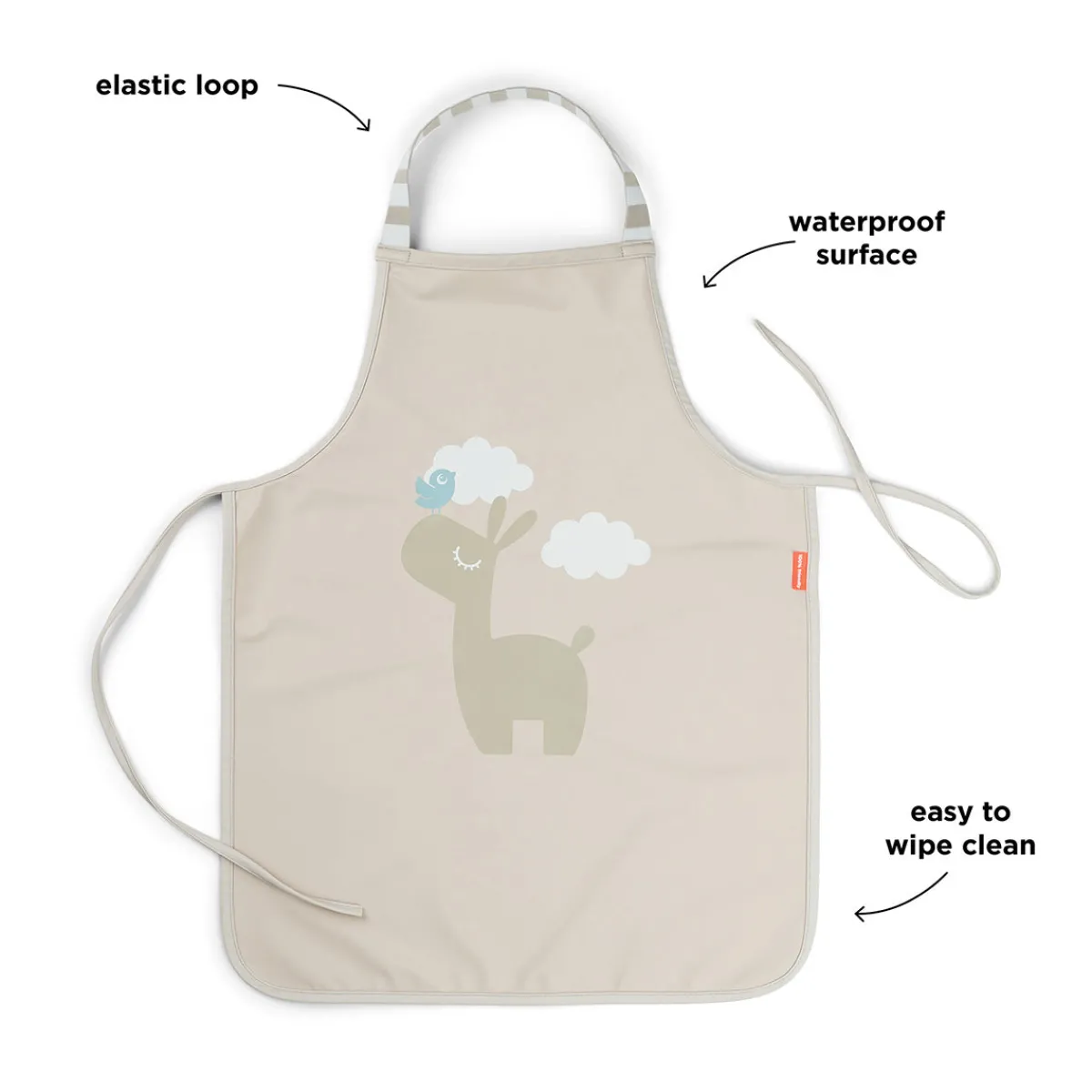 Den elastiske halsstrop gør det nemt for småbørn at tage forklædet på og af. Forklædet er skræddersyet til børn i forskellige aldre og kombinerer funktionalitet med sødt design, hvilket gør det til en perfekt ledsager i potentielt beskidte situationer.