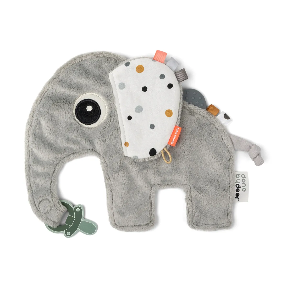 Den søde elefant holder sutterne i nærheden, når det er sengetid, eller når man er out & about. Den praktiske velcrolukning og den elastiske løkke gør det muligt at fastgøre både sutter med og uden håndtag.