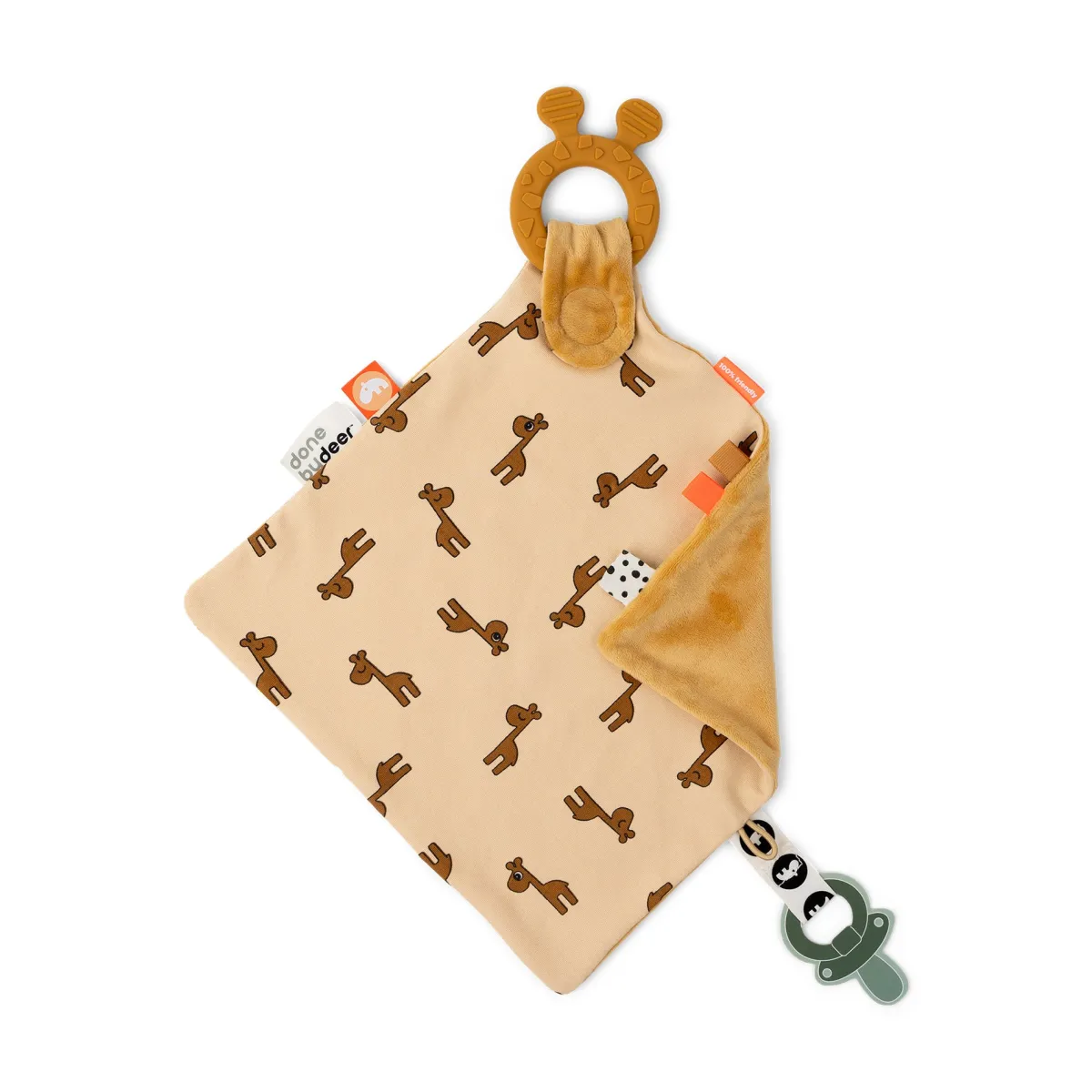 Den søde bidering i silikone med girafører og forskellige strukturer, der stimulerer og beroliger kløende gummer, kan tages af og bruges alene. Der er en praktisk velcrolukning og en elastisk løkke til at fastgøre en sut, som man kan have lige ved hånden.