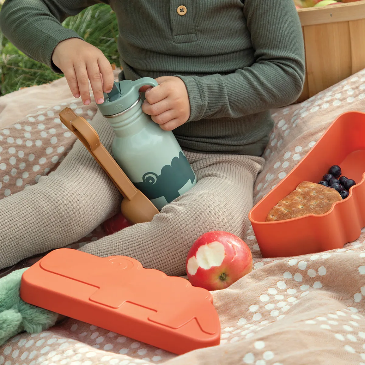 Det er nemt for små hænder at åbne og lukke den praktiske krokodilleformede madkasse, og låget kan bruges som tallerken. Den seje madkasse i Papaya tåler opvaskemaskine.