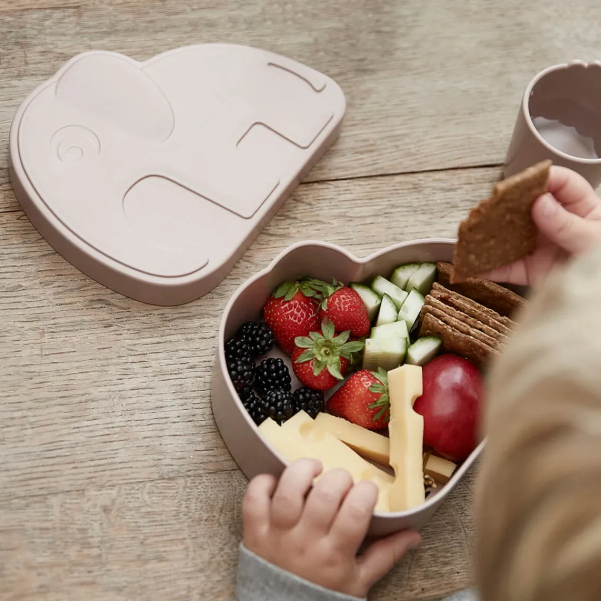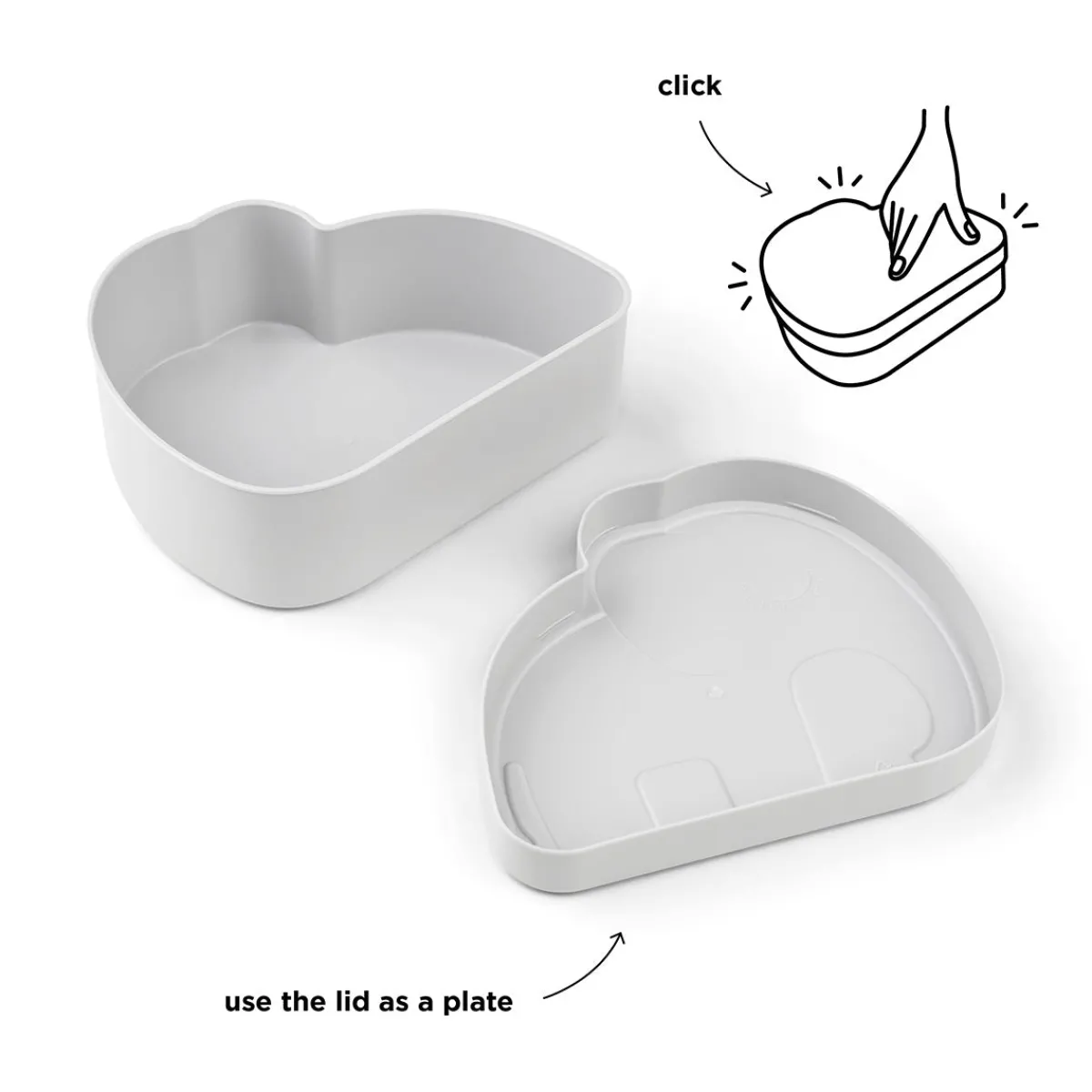 Det er nemt for små hænder at åbne og lukke den praktiske elfantformede madkasse, og låget kan bruges som tallerken. Madkassen tåler opvaskemaskine.