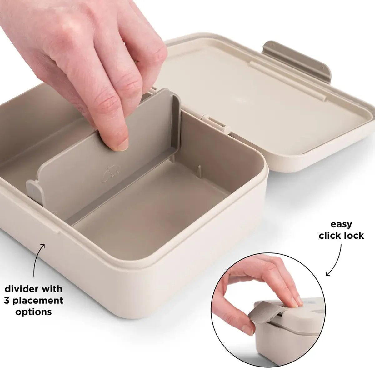 En smart, aftagelig skillevæg giver dig mulighed for at adskille mad og snacks, præcis som dit barn kan lide det – sandwiches på den ene side, frugt eller sprøde grøntsager på den anden. Med fleksible placeringsmuligheder tilpasser den sig forskellige måltider og appetit, dag for dag.
