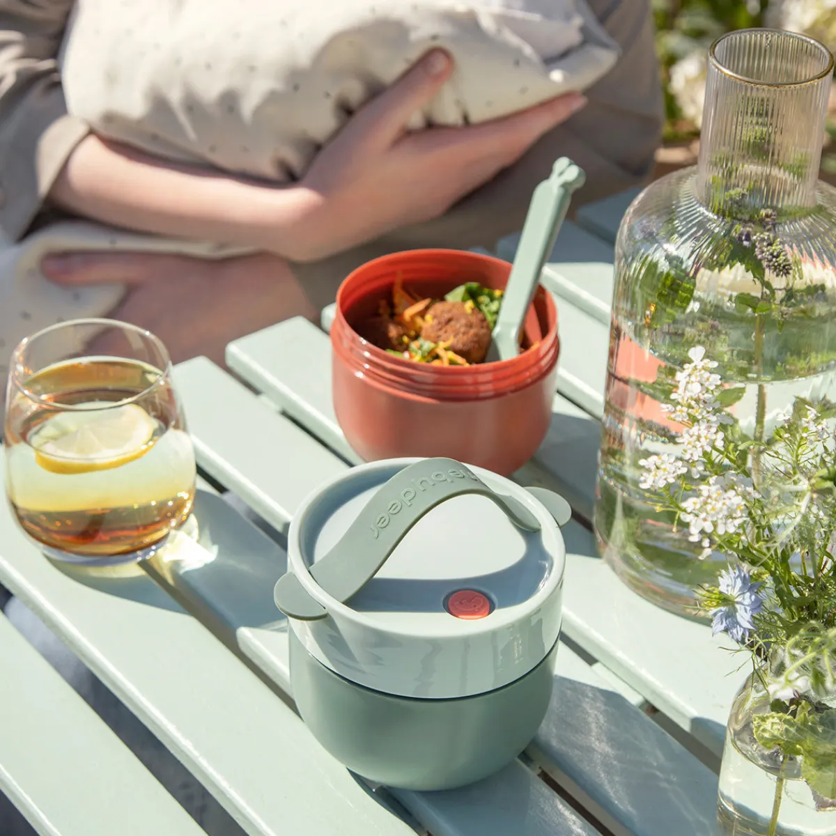 To go madbeholderen har et rent design i moderne farver. Et skruelåg holder godbidderne inde. Det aftagelige bærehåndtag i silikone gør det nemt for barnets hænder at bære skålen.