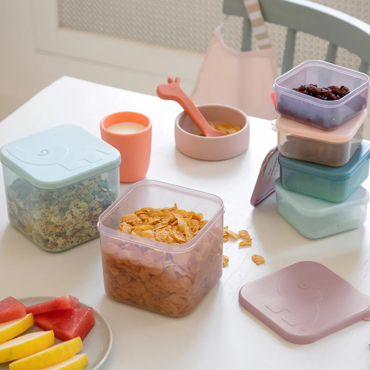 Brug disse praktiske beholdere til madopbevaring til at holde orden i køkkenskuffen eller tag dem med som en god ledsager til frokosten. Det søde sæt består af tre beholdere i to forskellige størrelser. Perfekt til at gemme og medbringe favoritter.