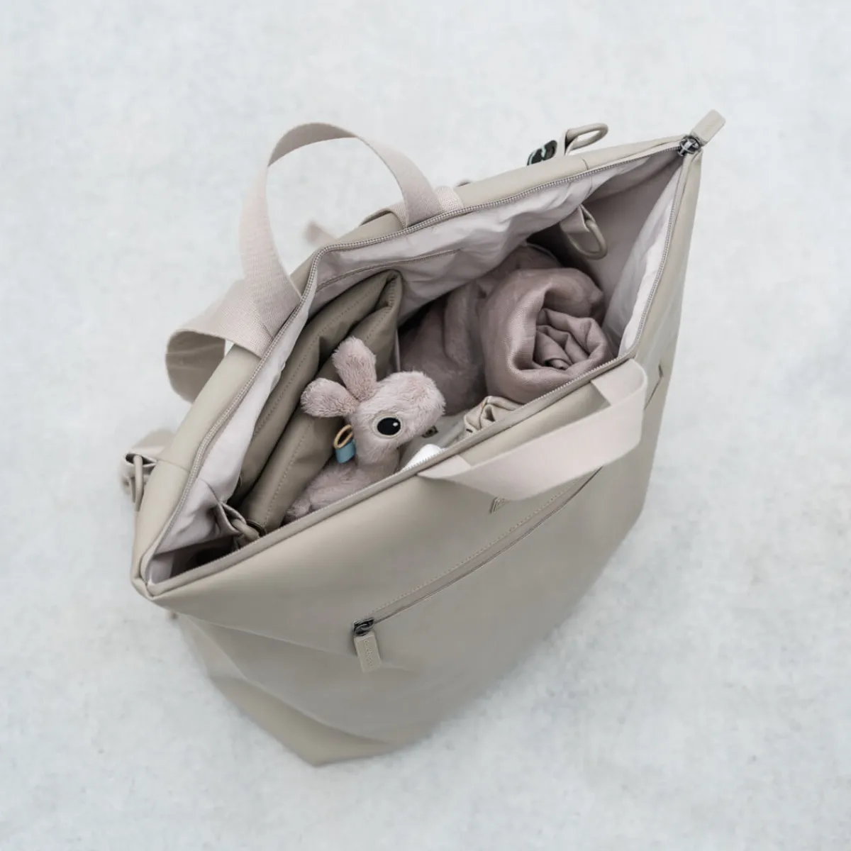 Et praktisk foldbart pusleunderlag med vandafvisende overflade og to barnevognskroge medfølger. Både de vandtætte lynlåse og den vandafvisende overflade gør rygsækken klar til hverdagens slid. Tag på eventyr med stil med denne unisex-rygsæk i en dejlig sandfarve.