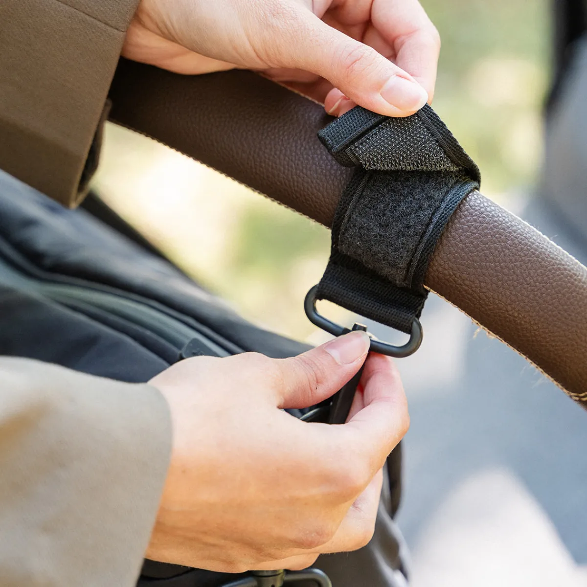 • A flexible shoulder strap and pram hooks are included