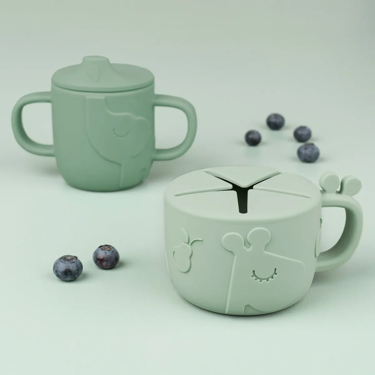 Den søde grå kop med giraffen og elefanten er lavet af fødevaregodkendt silikone, som gør den brudsikker og giver et godt greb.