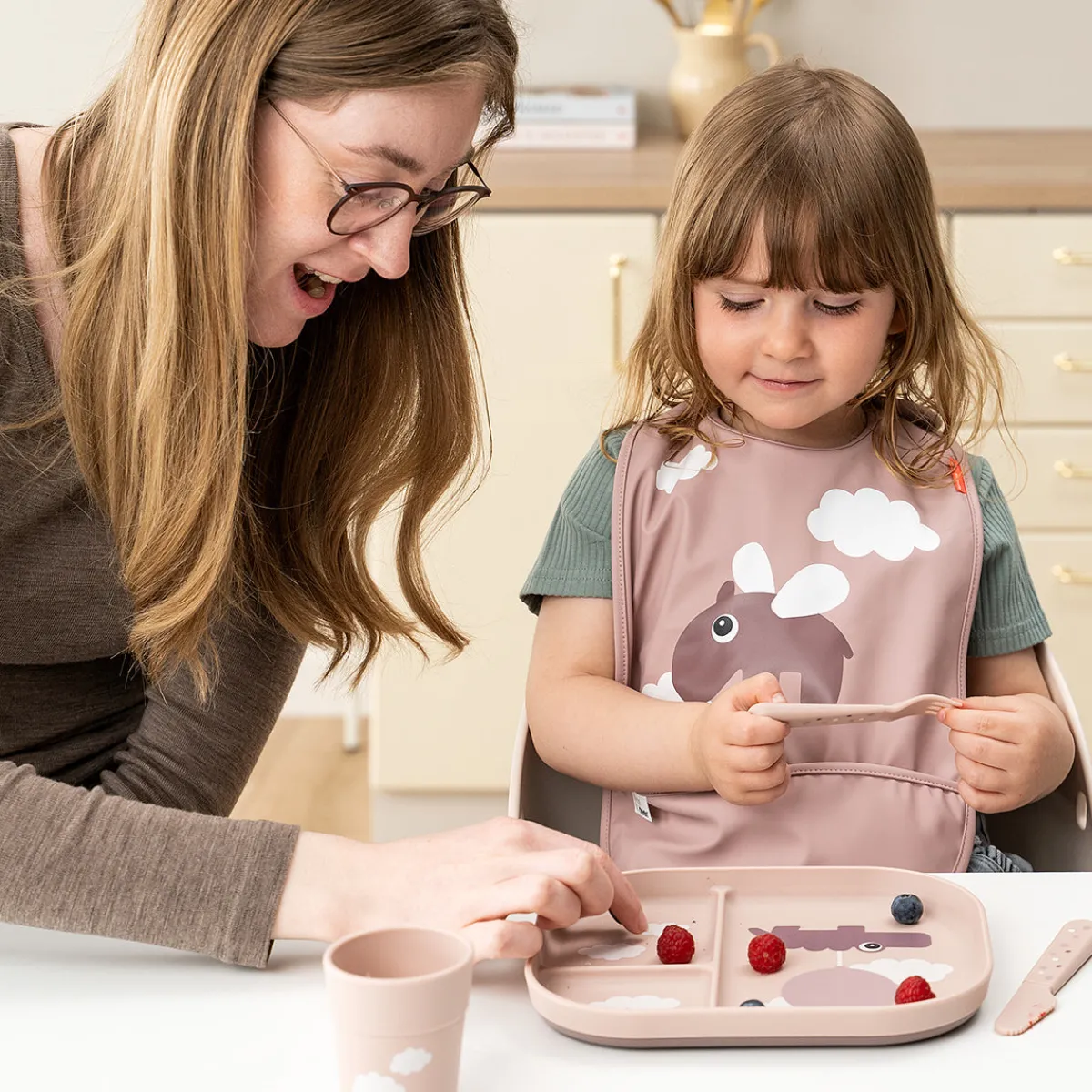 Rumtallerkenen i pudder er trykt med et legesygt Happy Clouds motiv. Croco og Birdee udforsker verden blandt skyerne og inviterer dit barn til at opleve nye smage og konsistenser. Basens mørkere pudder giver en tofarvet detalje.