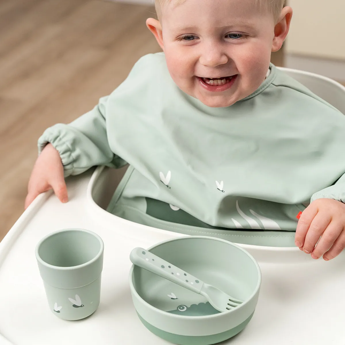 Foodie-skålen i grøn er trykt med et cool motiv af den hjertevarme krokodille Croco, der kigger på et par ildfluer. Dens silkematte overflade matcher resten af Foodie-kollektionen. Basens mørkere grønne farve giver en fin tofarvet detalje.
