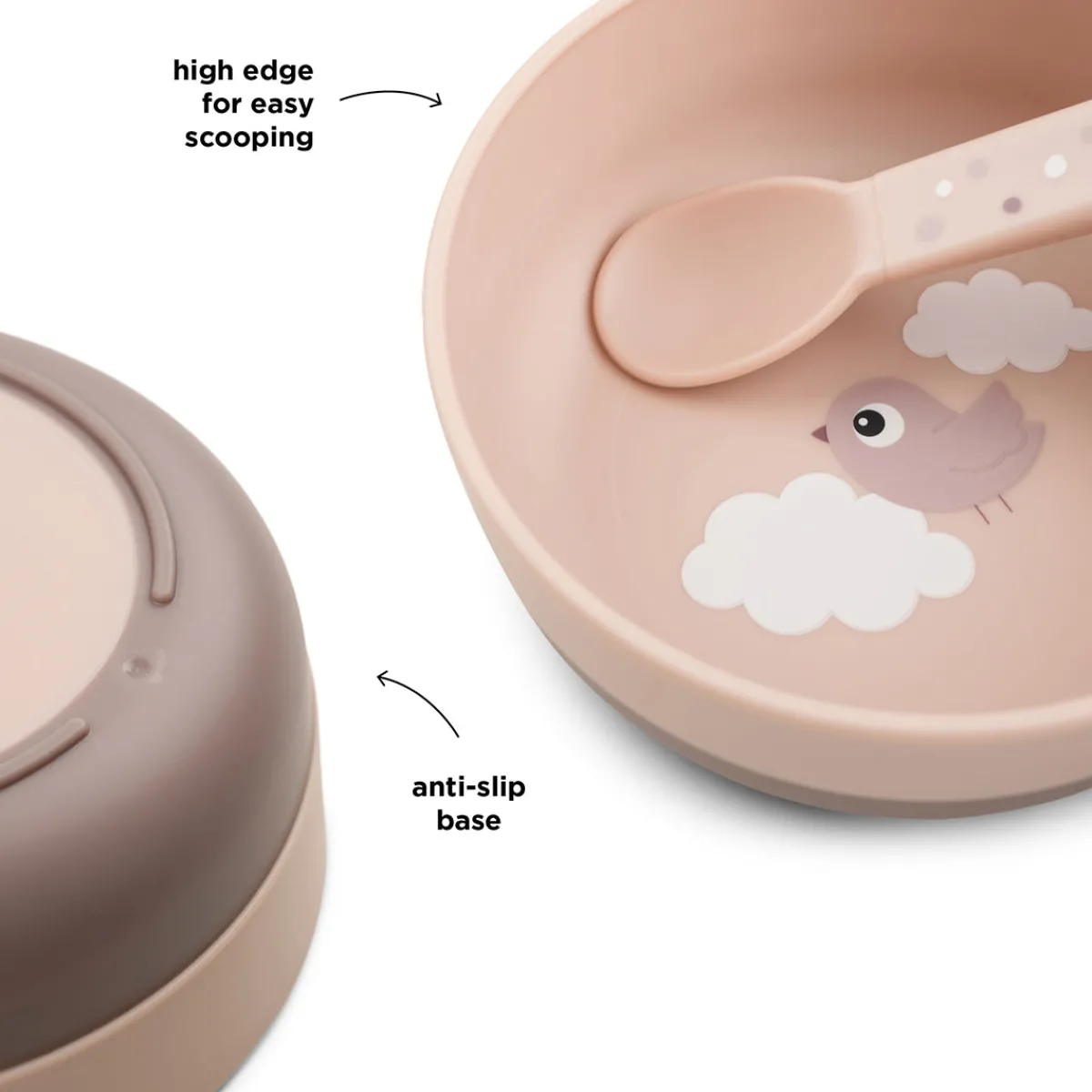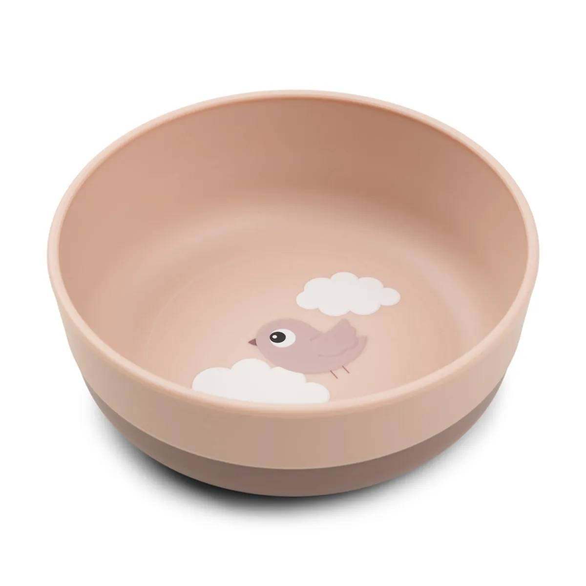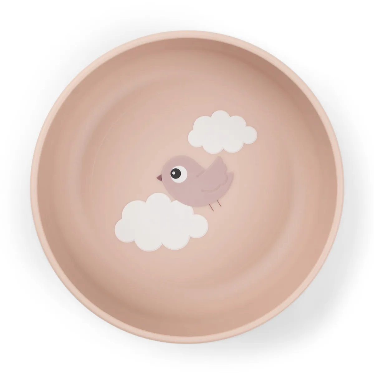 Foodie-skålen i pudder er trykt med et sødt motiv af den muntre Birdee, der nyder livet blandt skyerne. Dens silkematte overflade matcher resten af Foodie-kollektionen. Basens mørkere pudder giver en fin tofarvet detalje.