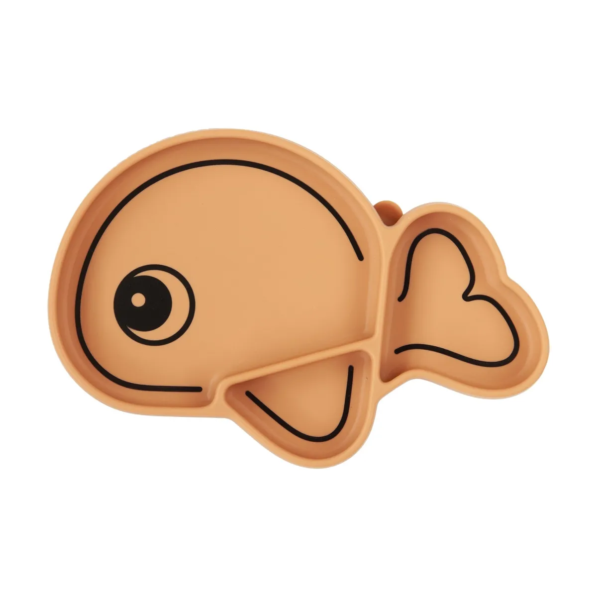 Den praktiske børnetallerken har en varm sennepsfarve med sort konturprint. Hvalen Wallys form gør den ekstra sjov at bruge. Med sine praktiske funktioner og sit søde design er denne tallerken perfekt til børn, der er begyndt at spise selv.
