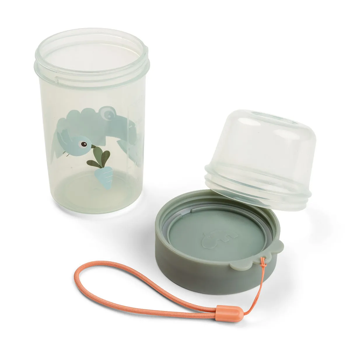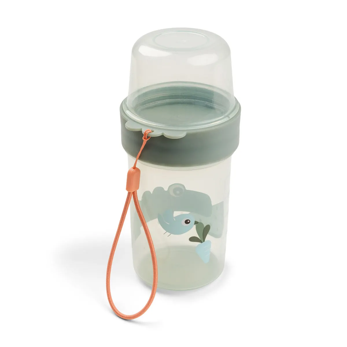 Pak en lækker frokostsnack, og lad vores Deer friends passe på den. På forsiden af denne grønne beholder nyder Croco en skive vandmelon, og på bagsiden flyver Birdee af sted med en friskplukket gulerod.