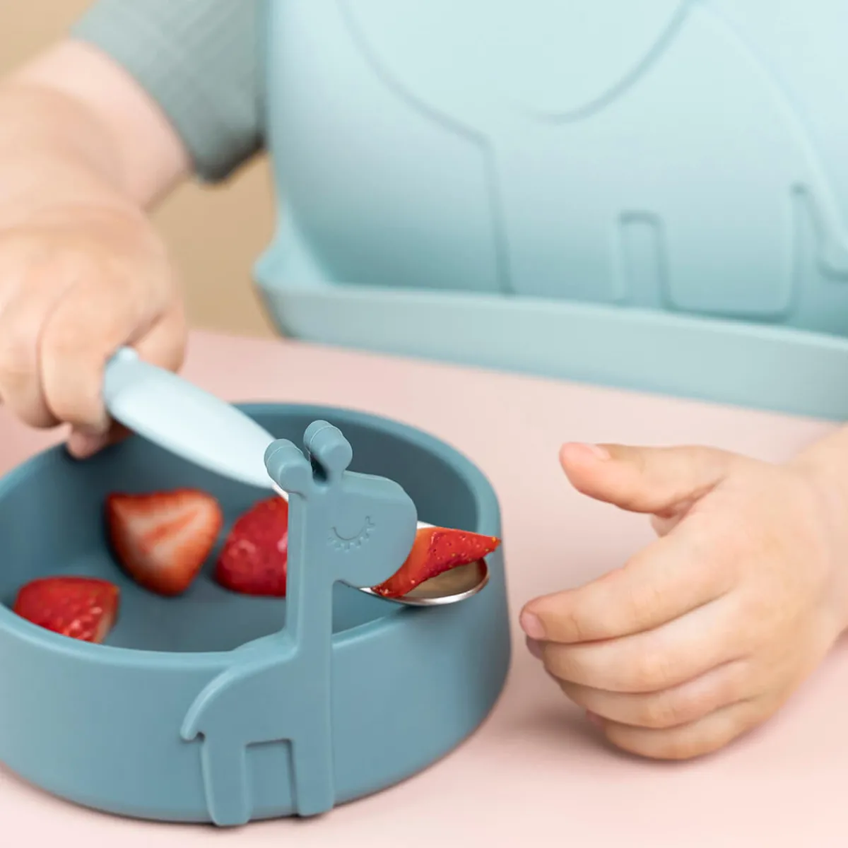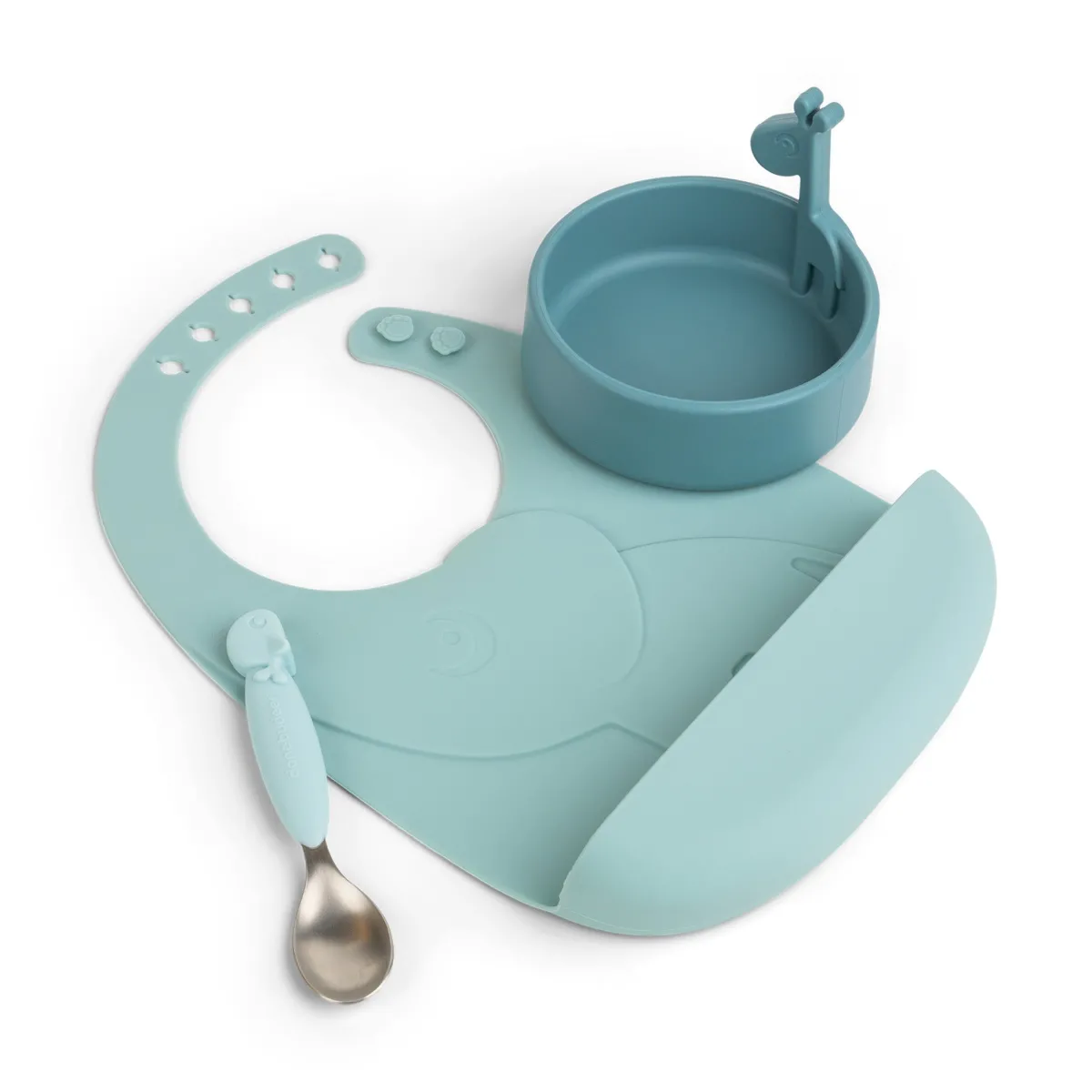 Børnene vil nyde at have de sjove dyr med til måltiderne – lad Elphees lomme fange den mad, der glipper, og lad Raffi opmuntre dem til at nå den spændende milepæl, det er at spise selv. Det søde gavesæt er i bløde toner af blå.
