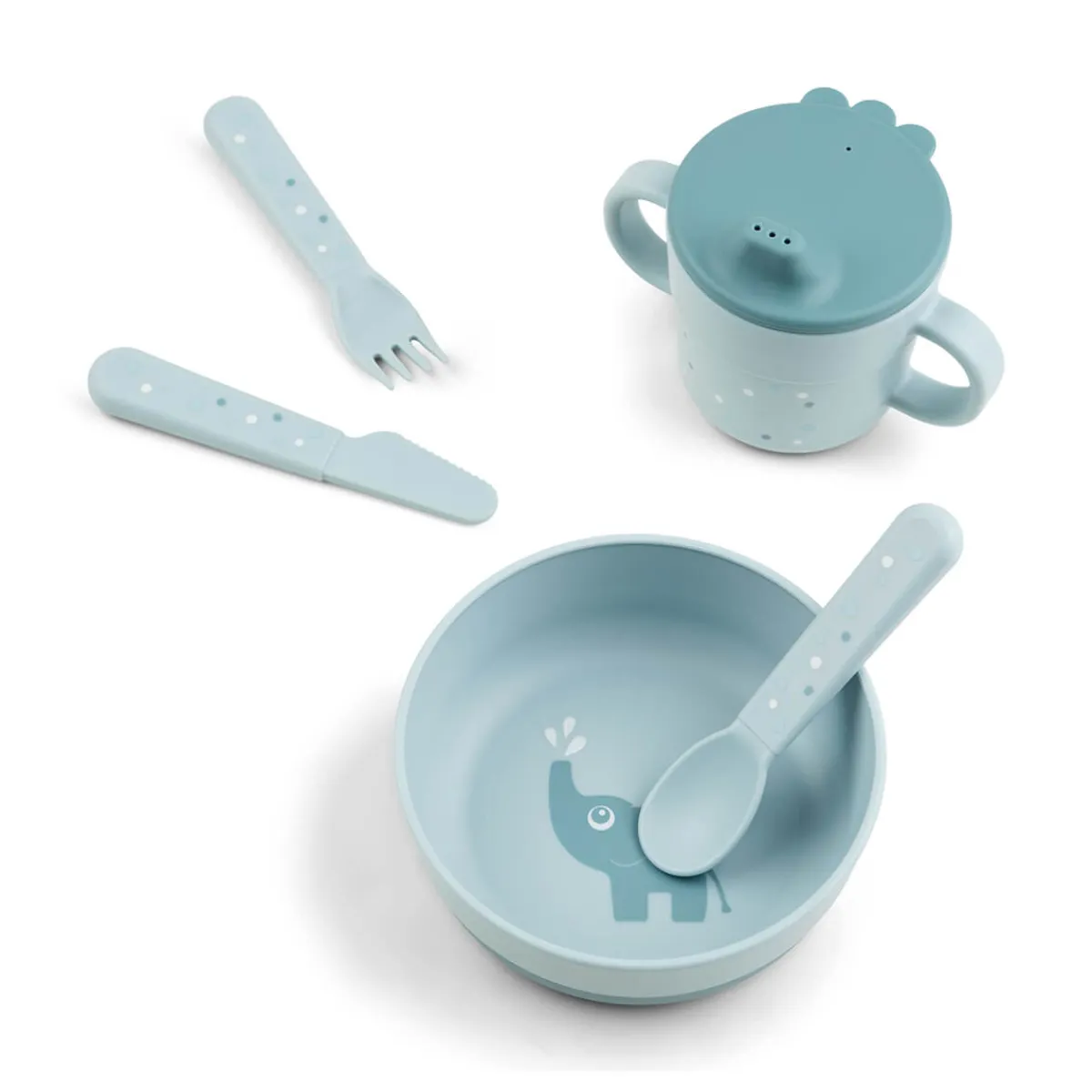 Det blå sæt er trykt med et dejligt motiv af den muntre elefant Elphee, der fanger ildfluer med et net. Lad dit barn være med til at have det sjovt, mens det jagter nye måltidsoplevelser.